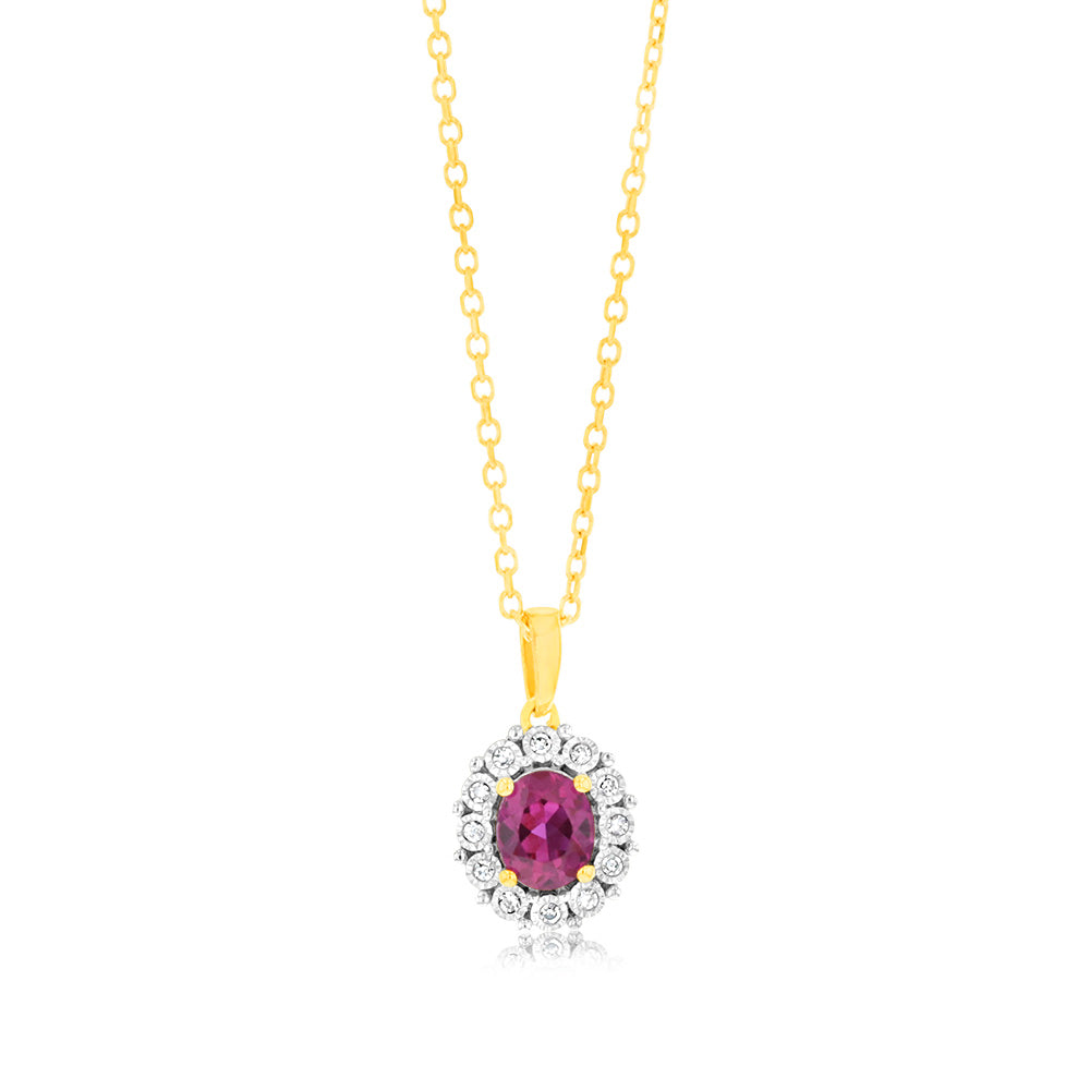 0.39 Carat Created Ruby Oval Shaped and Diamond Pendant with 45cm Chain in 9ct Yellow Gold