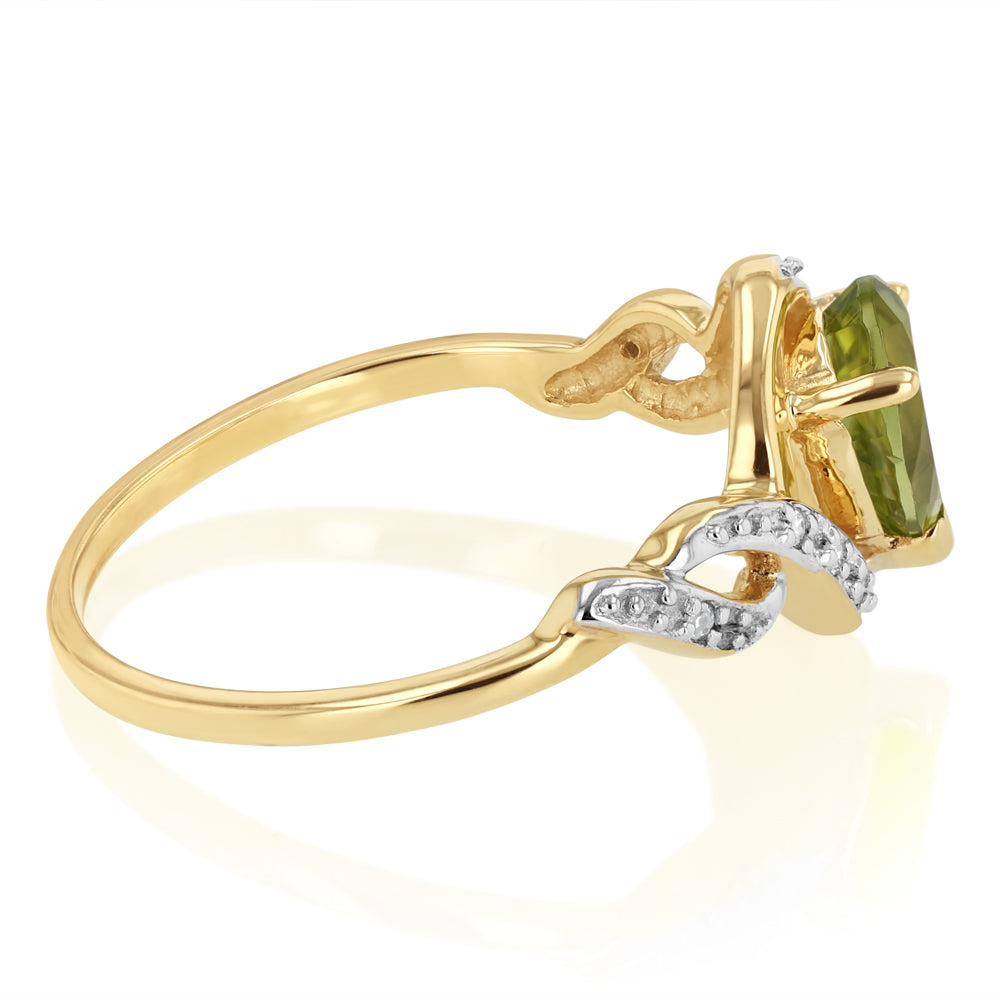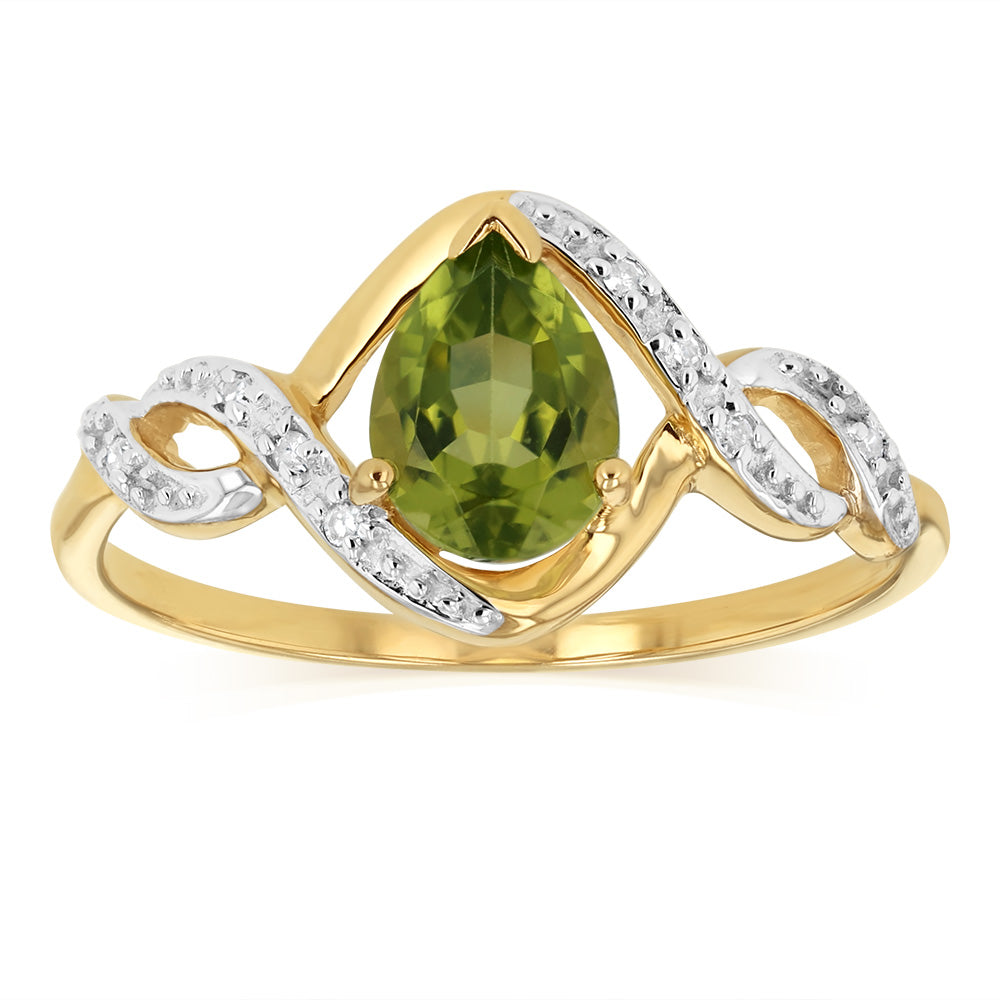 0.67 Carat Peridot Pear Shaped and Diamond Ring in 9ct Yellow Gold