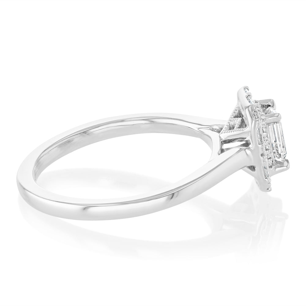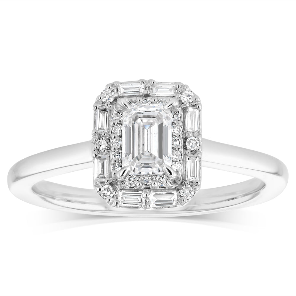 1/2 Carat Diamond Ring With Emerald Cut Centre Diamond Surrounded by Brilliant and Baguette Diamond Halo in Platinum