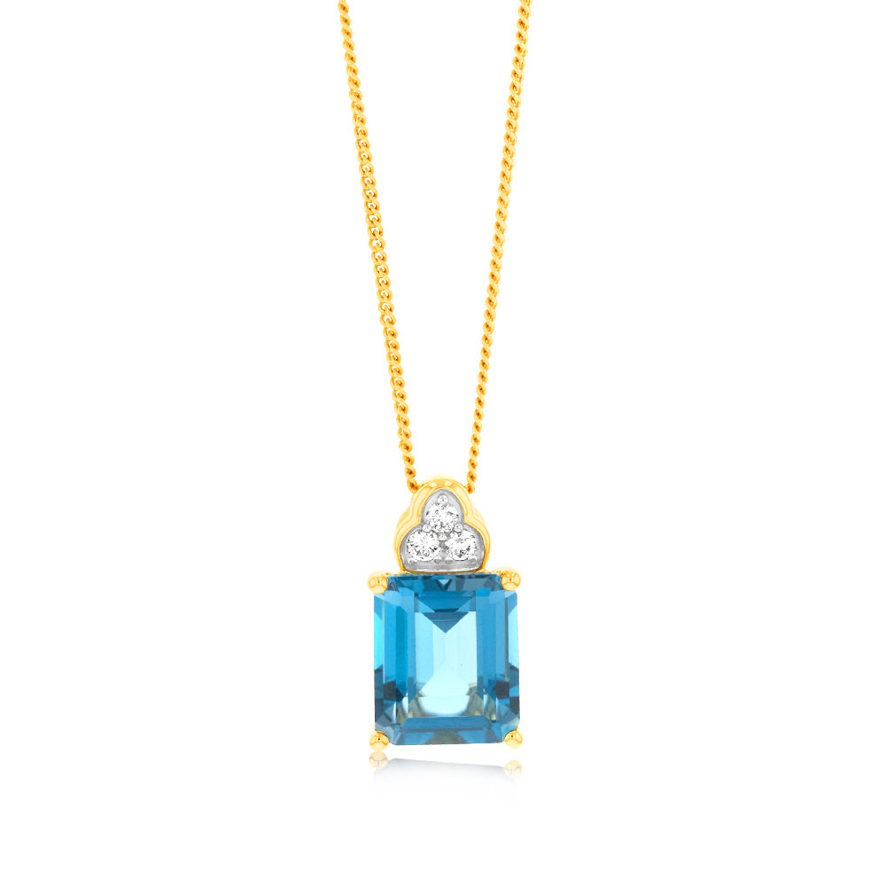 9ct Gold 5.6ct London Blue Topaz in Emerald Cut and 1/10 Carat Diamond Pendant