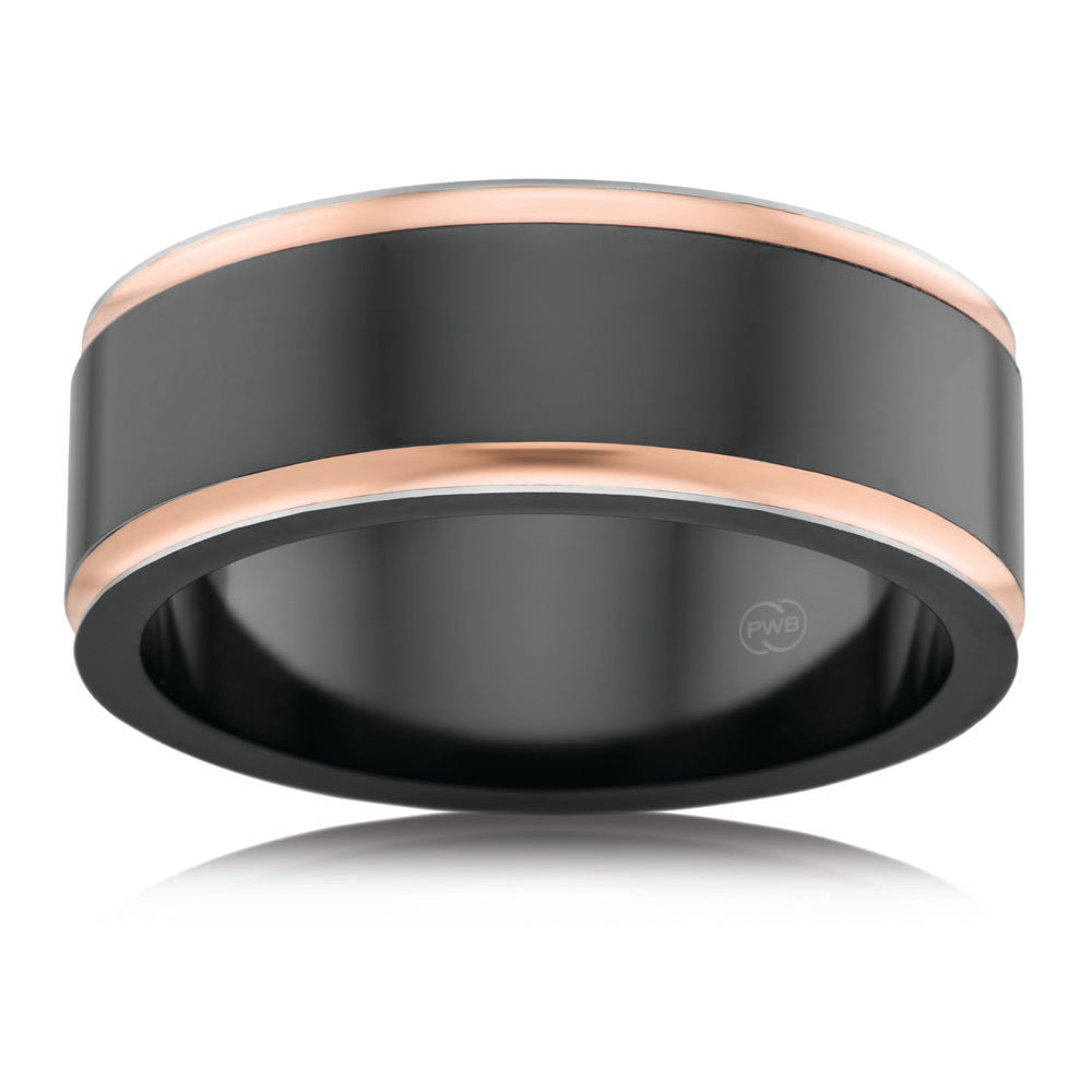 9ct Rose Gold and Zirconium 8mm Gents Ring. Sizes T/U
