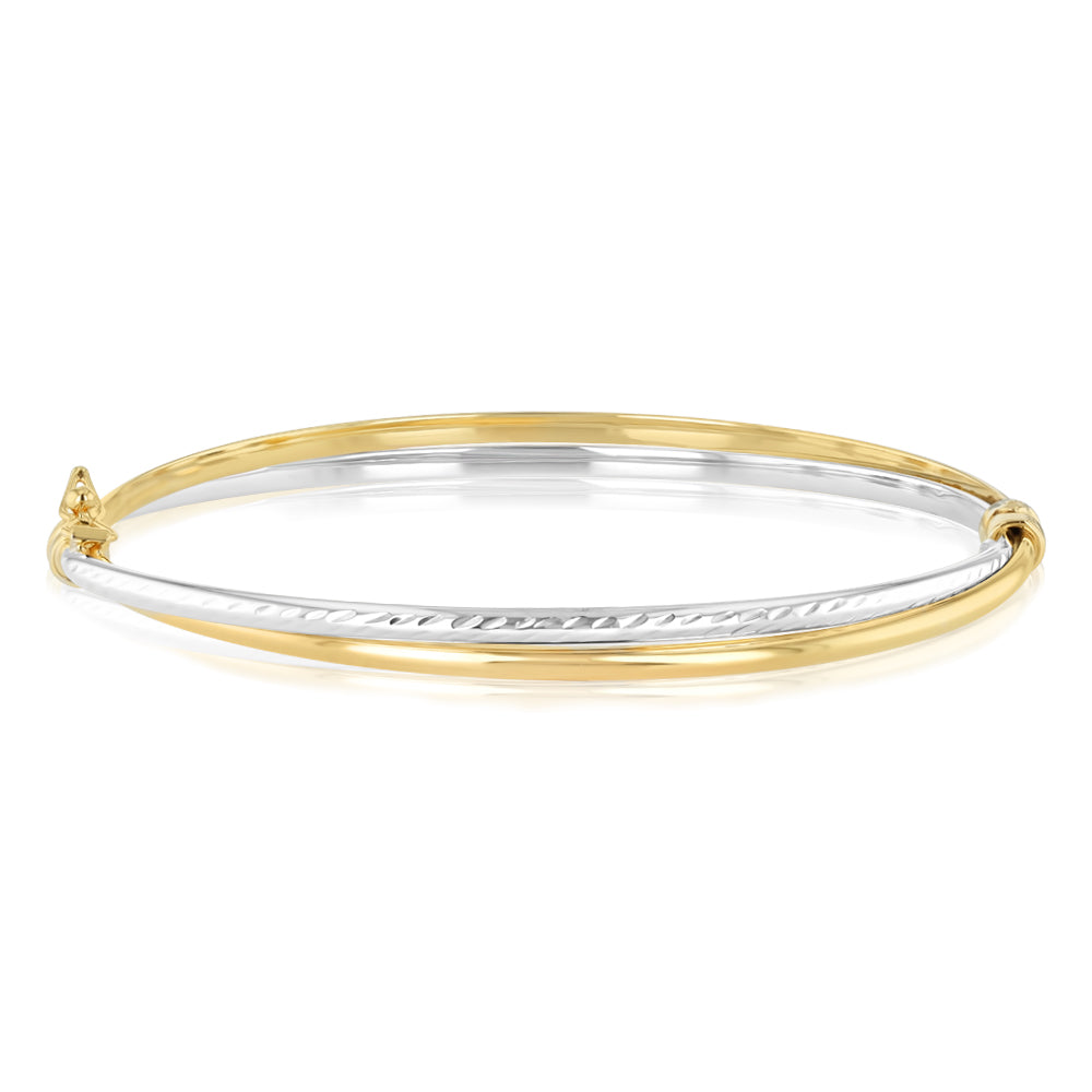 9ct Yellow And White Two-Tone Gold Plain And Textured Hinged 60mm Bangle