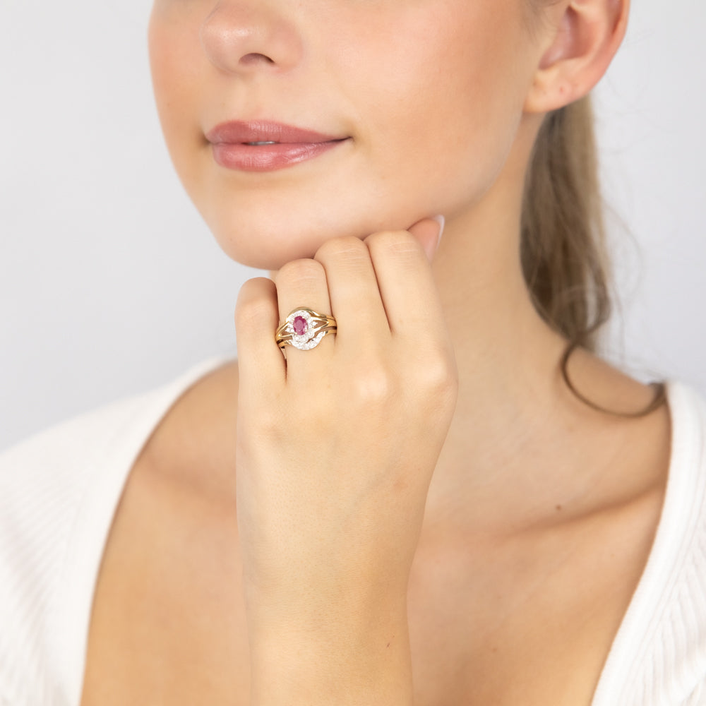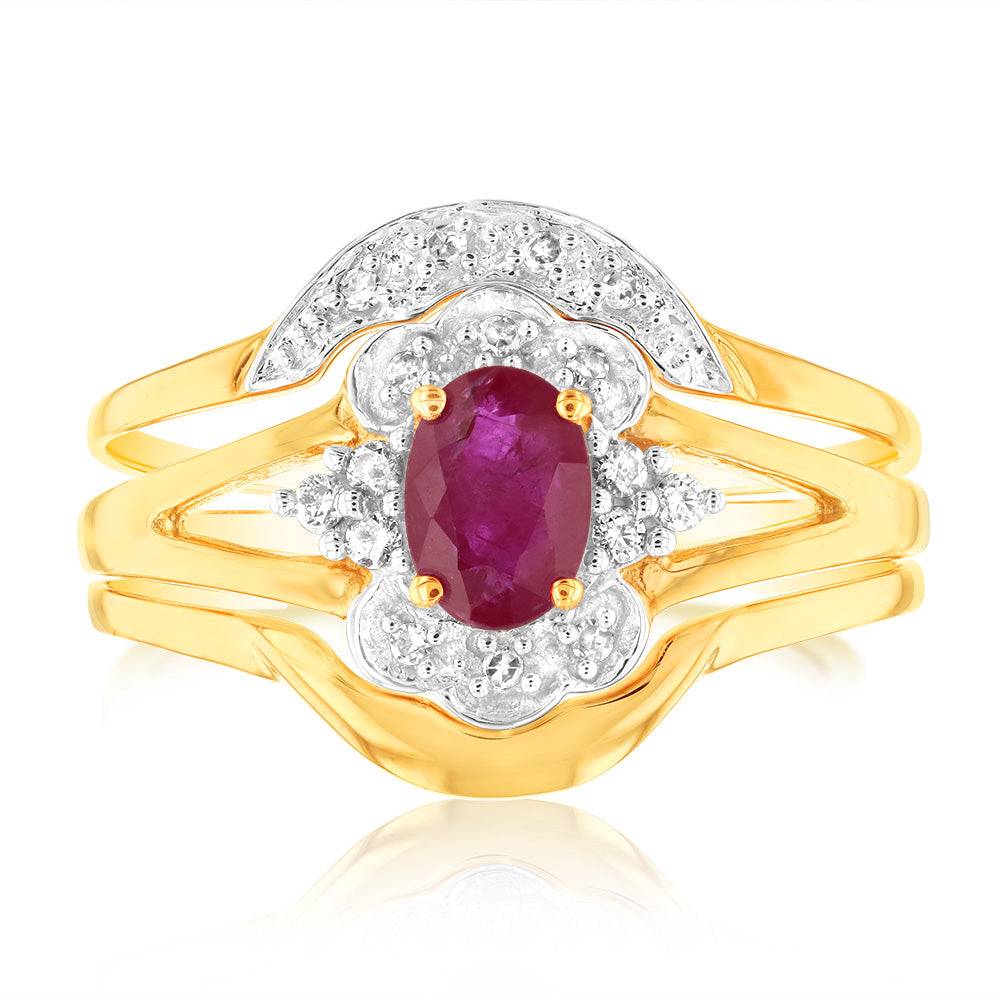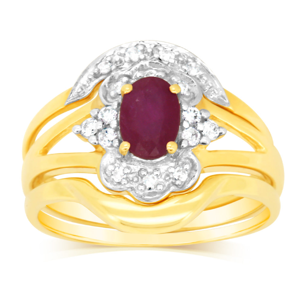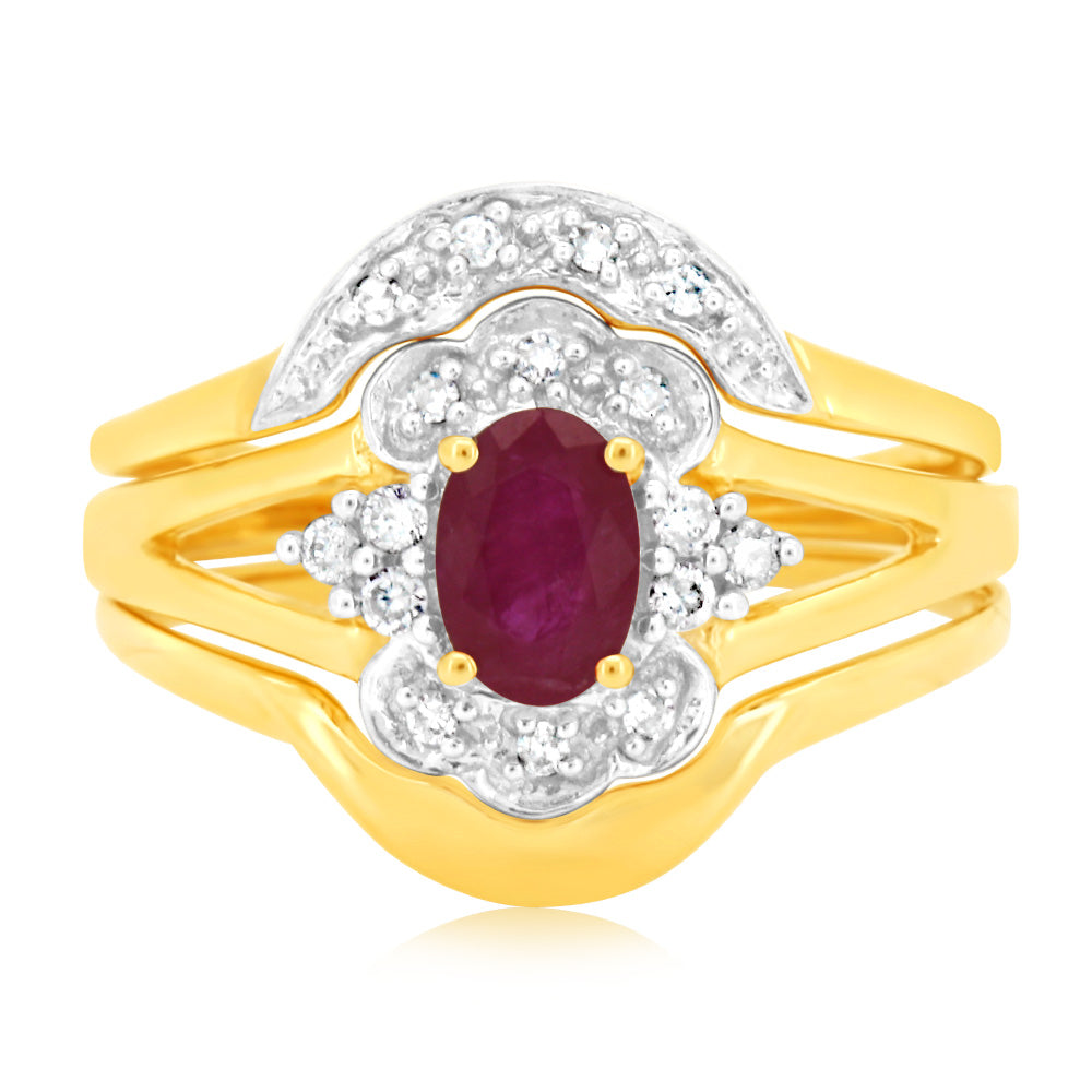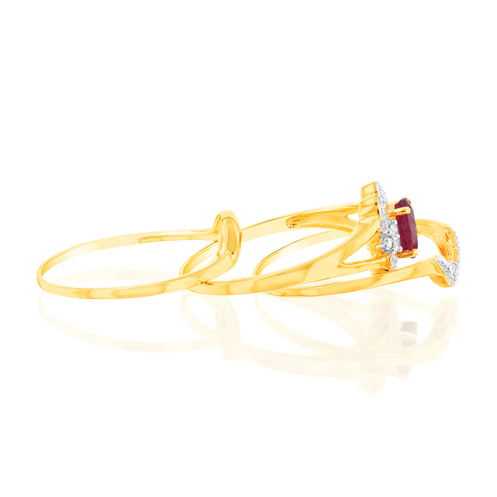 0.55 Carat Natural Ruby & 16 Diamond Bridal Set 3-Ring in 9ct Yellow Gold