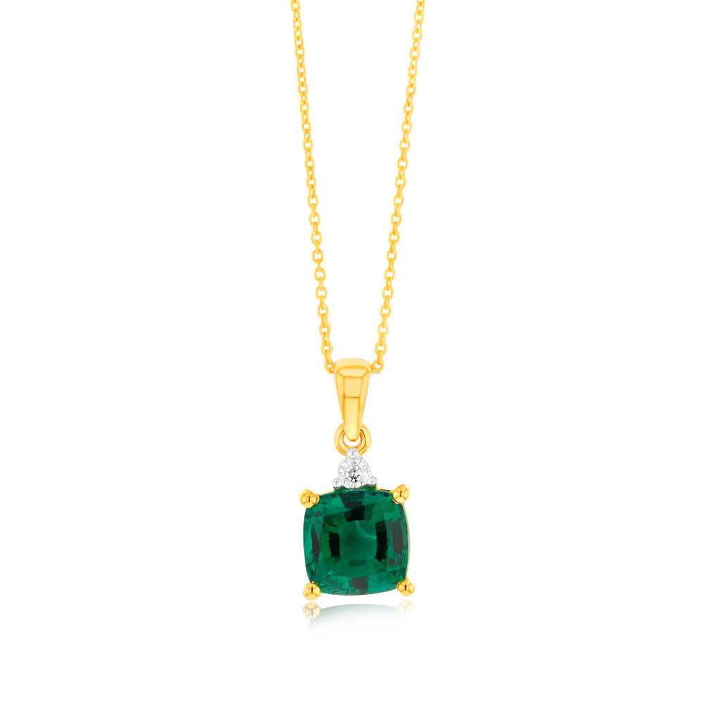 9ct Yellow Gold 1/3ct Created Emerald and Diamond Pendant On 45cm Chain