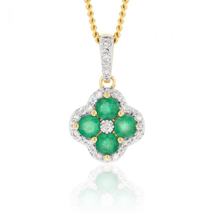 9ct Yellow Gold 1ct Natural Emerald and 1/10 Carat Diamond 4 Leaf Clover Pendant