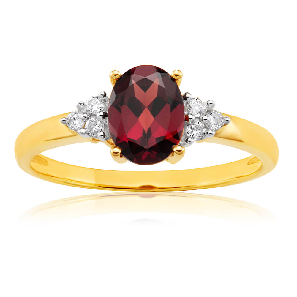 9ct Yellow Gold 4x6mm 1.4ct Oval Garnet + Diamond Ring