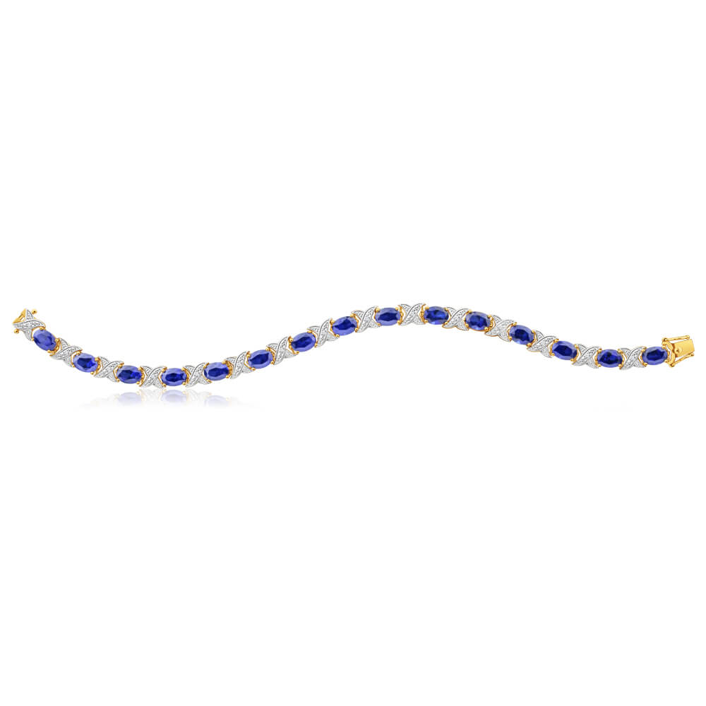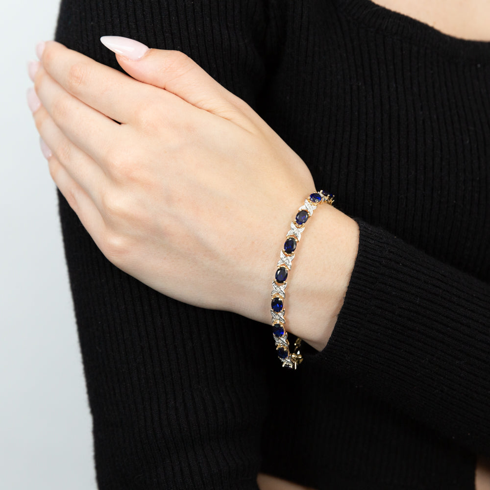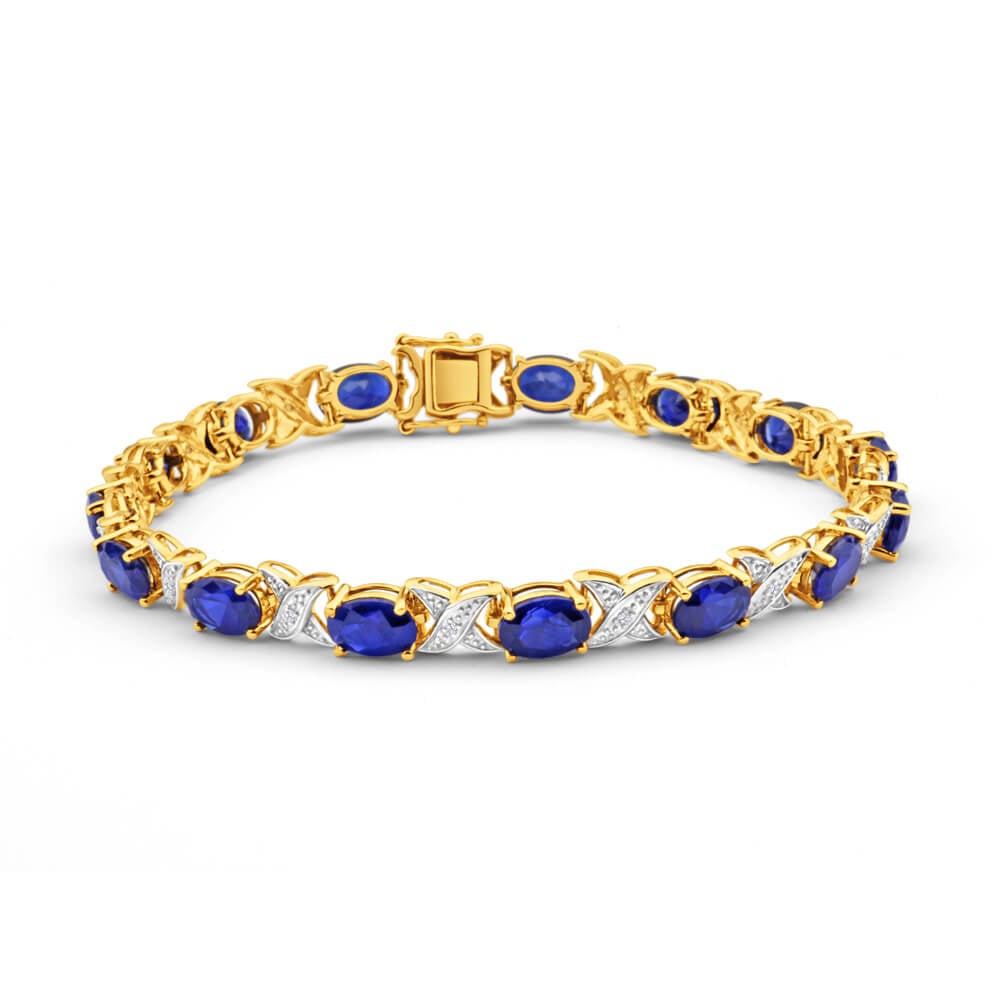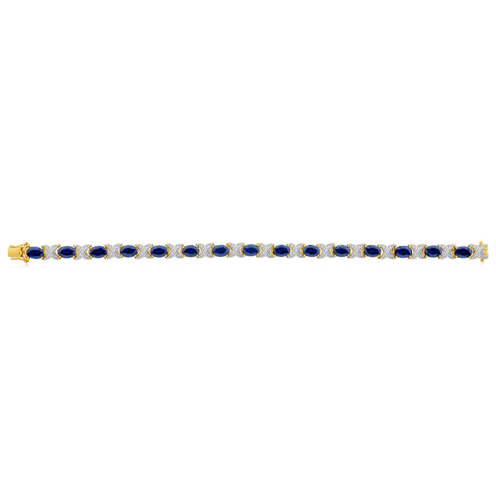 9ct Yellow Gold 7x5mm Oval Cut Created Sapphire and Diamond 19cm Crossover Bracelet
