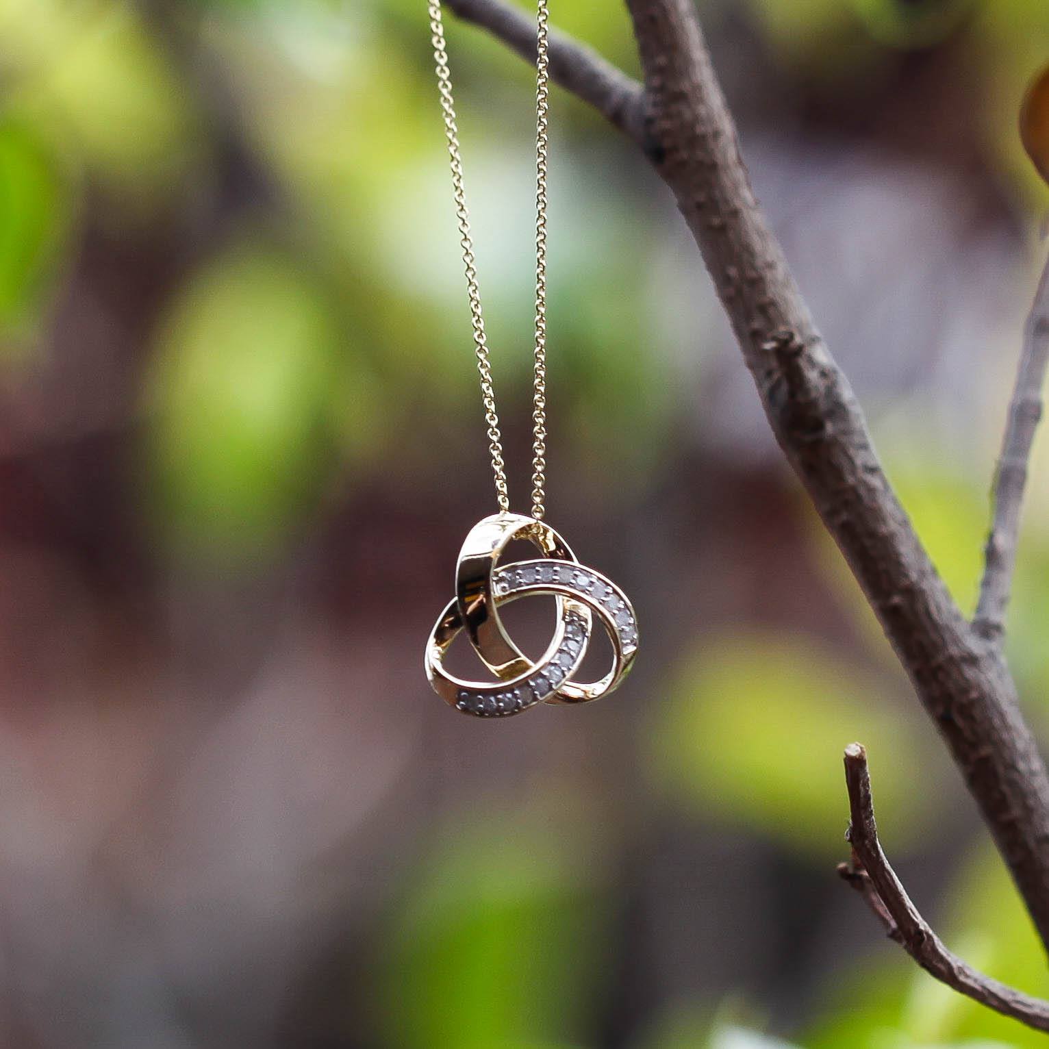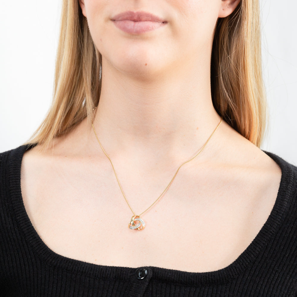 We love this sparkling diamond knot pendant. The stunning pendant features 18 brilliant cut diamonds and is crafted in 9ct yellow gold.