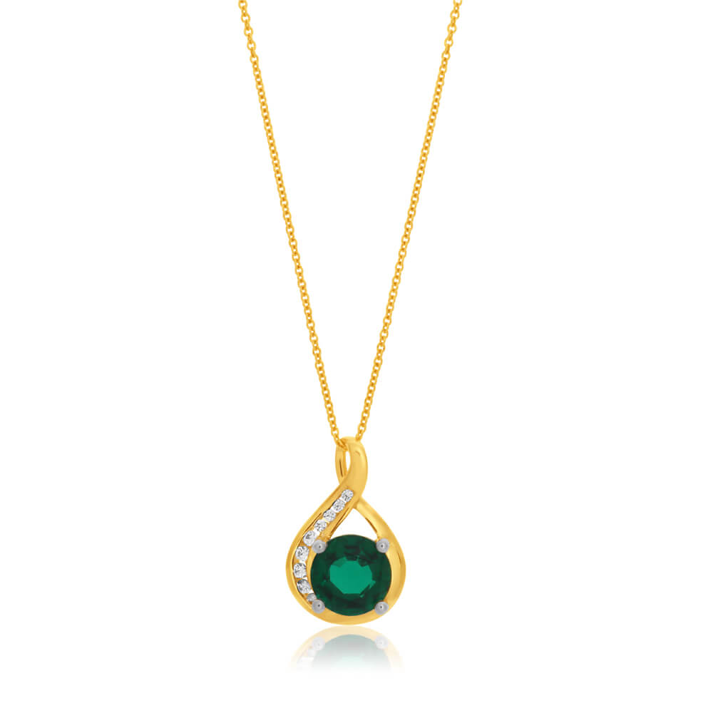 9ct Yellow Gold Created Emerald and Zirconia Pendant With 45cm Chain