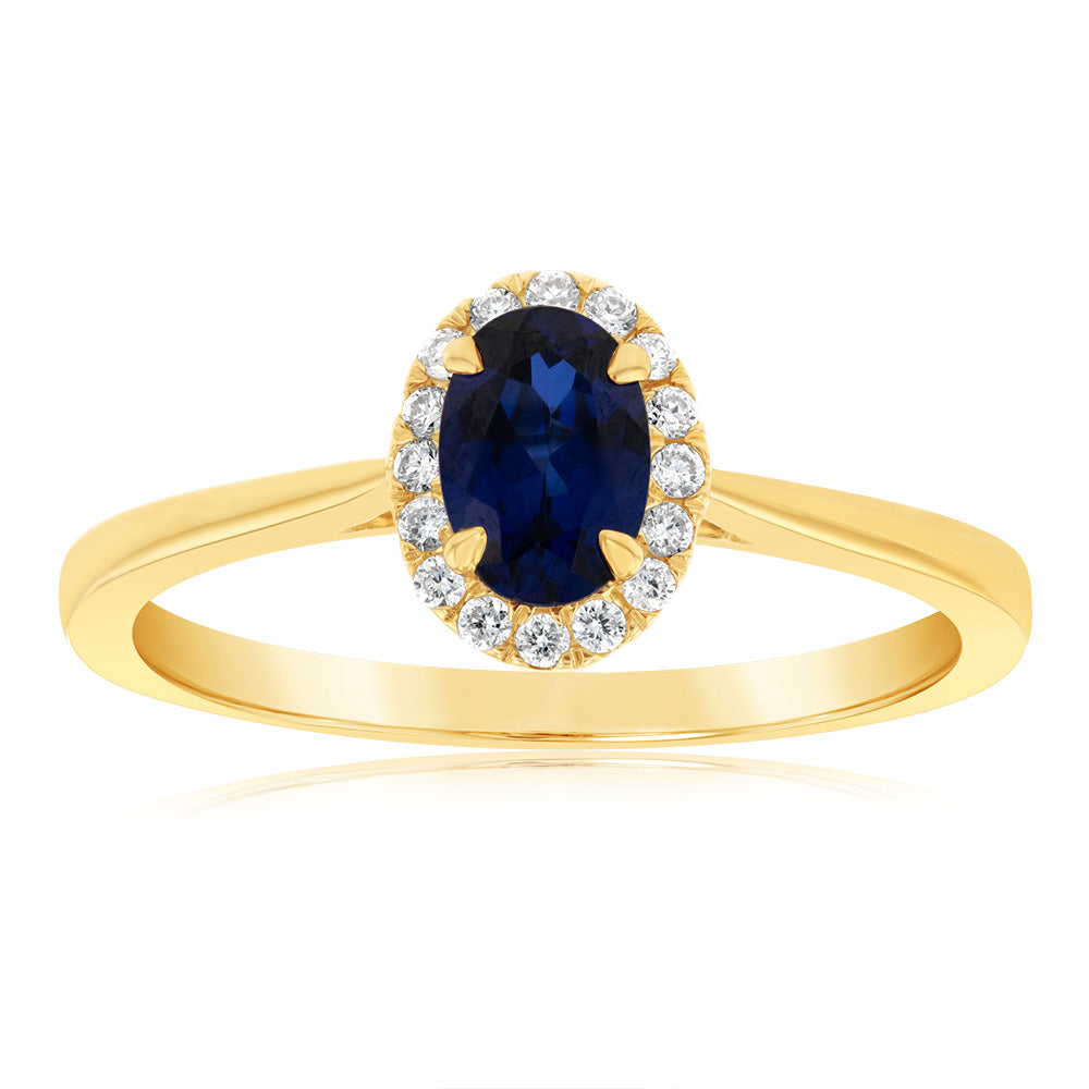 9ct Yellow Gold Created Oval Sapphire& Diamond Halo Ring