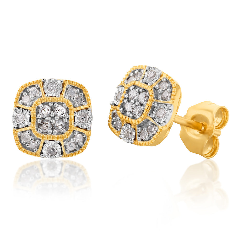 9ct Yellow Gold Cushion Shape Cluster Diamond Stud Earrings