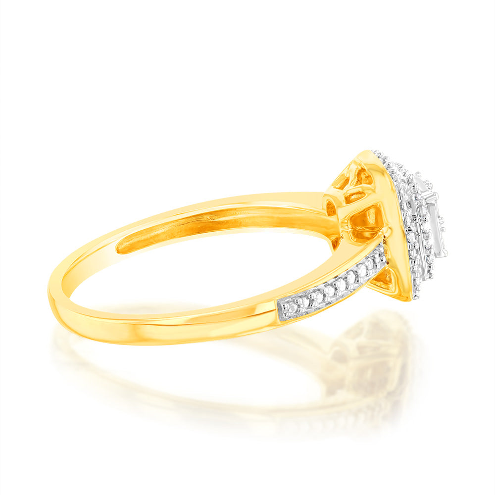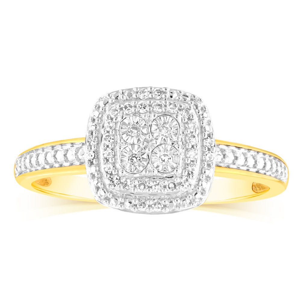 9ct Yellow Gold Cushion Shaped Fancy Ring with 32 Round Brilliant Cut Diamonds