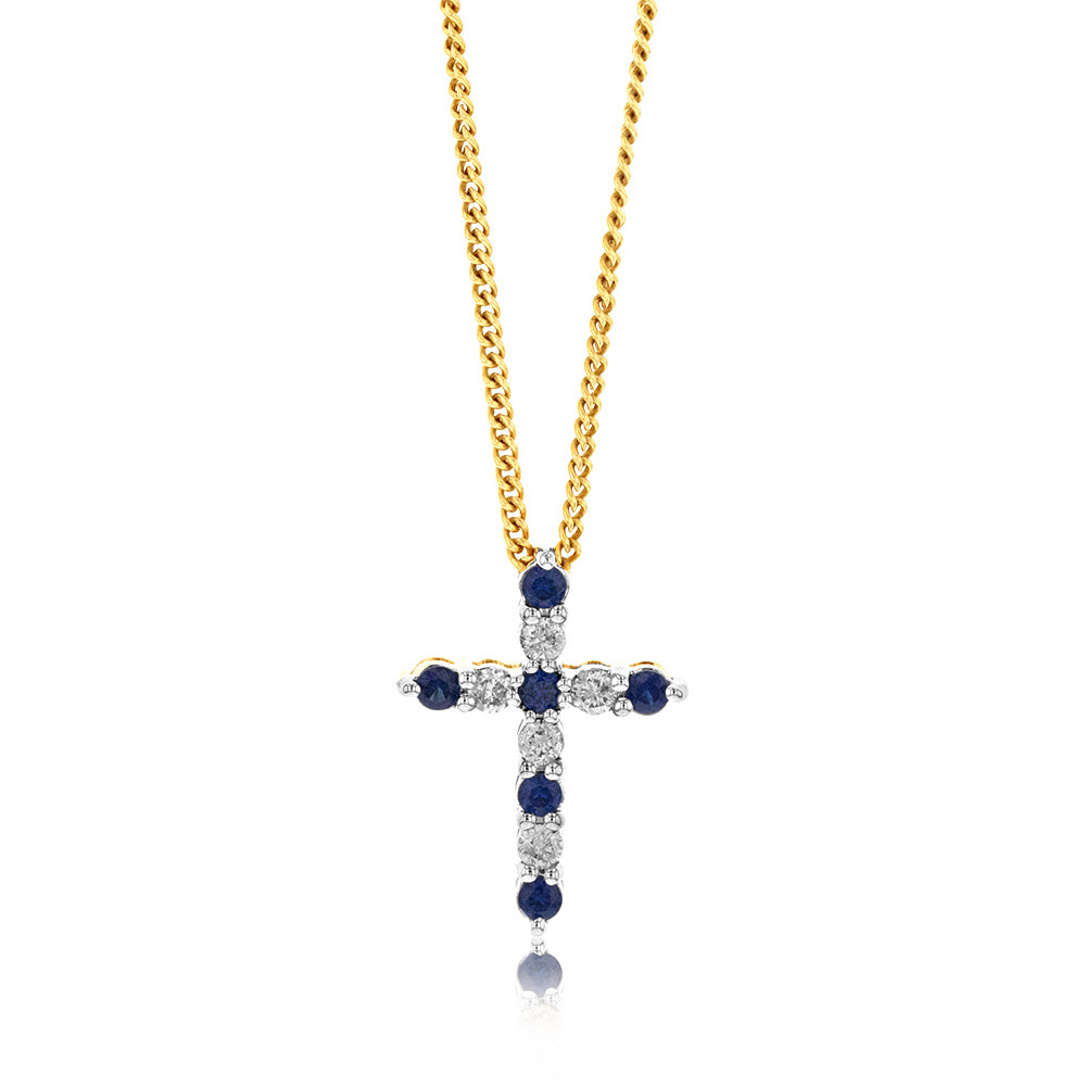 9ct Yellow Gold Diamond And Created Sapphire Cross Pendant