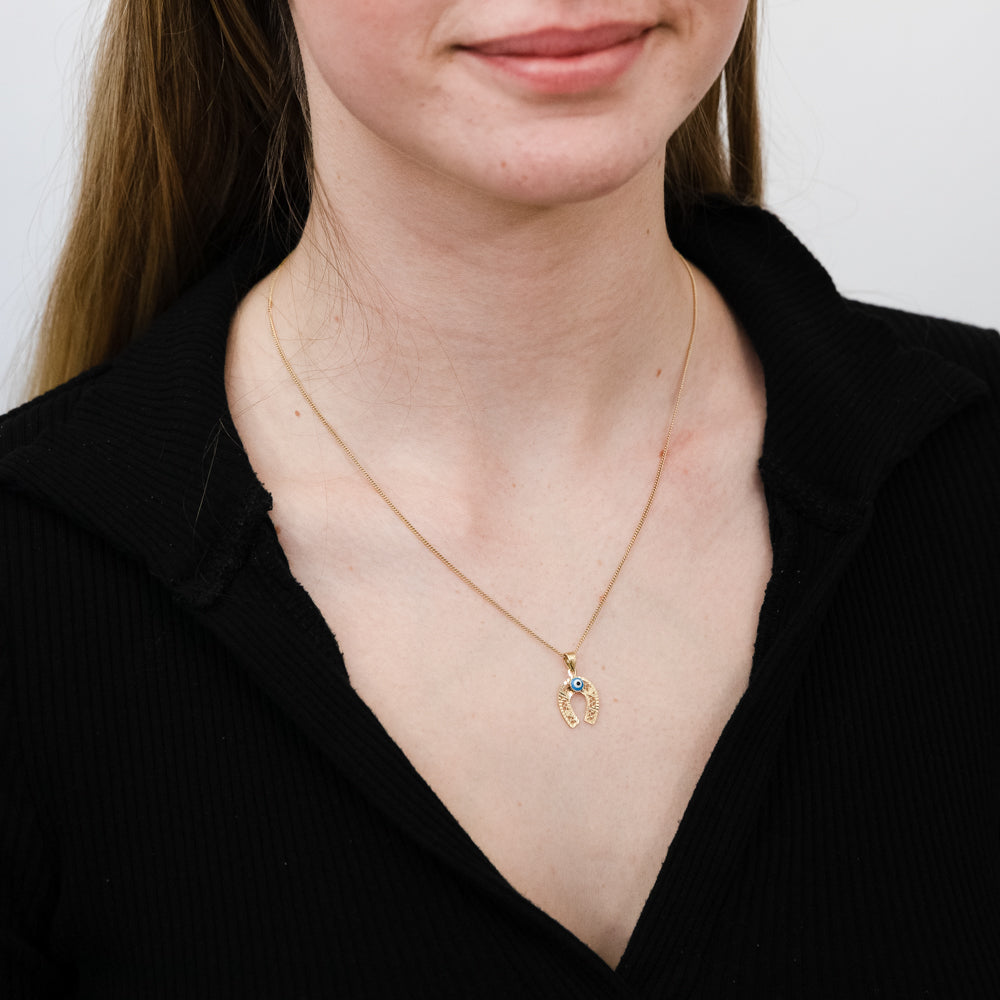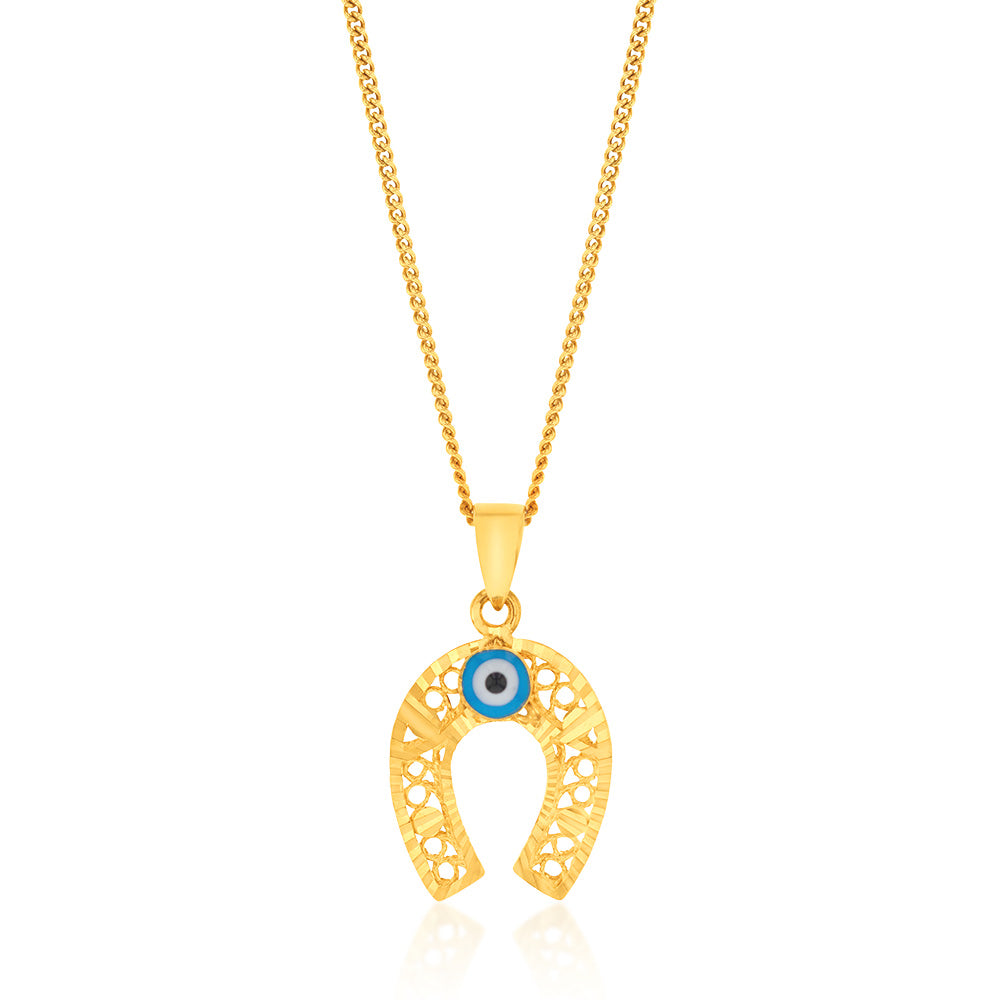 9ct Yellow Gold Diamond Cut Horse Shoe And Evil Eye Pendant