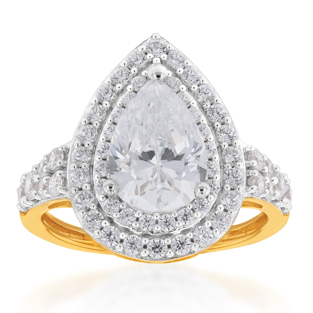 9ct Yellow Gold Double Halo Pear and Channel Zirconia Ring
