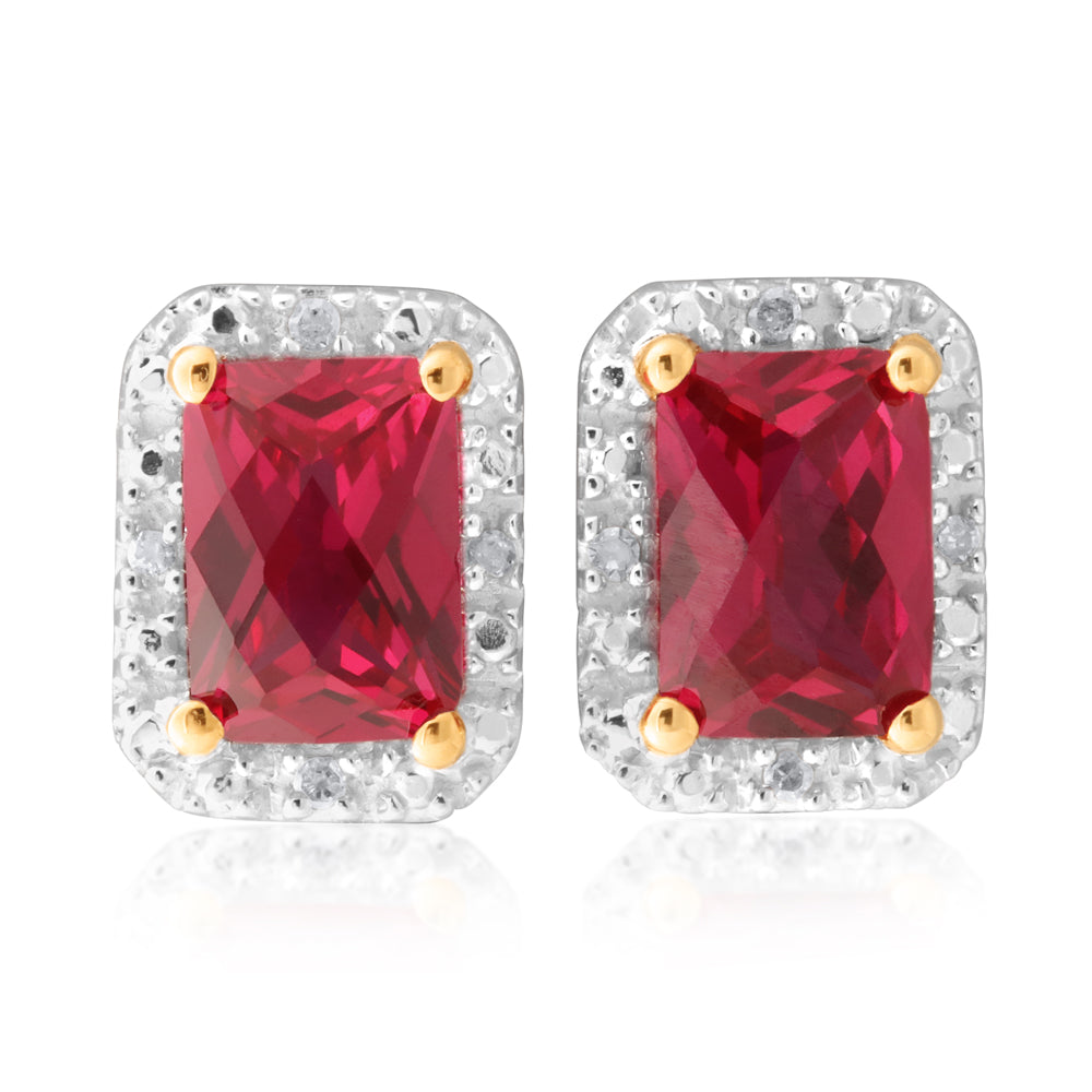 9ct Yellow Gold Emerald Cut Created Ruby And Diamond Halo Earrings
