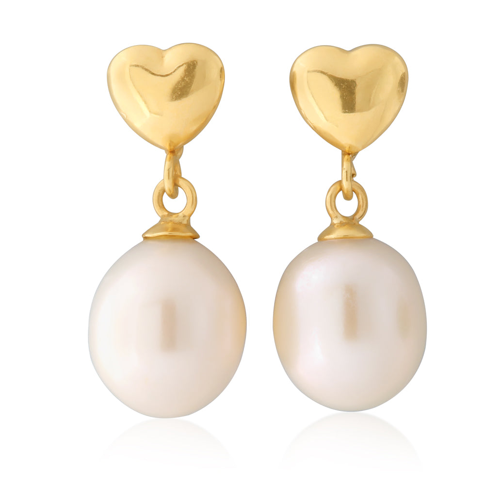 9ct Yellow Gold Fresh Water Pearl 7-7.5mm and Gold Heart Drop Earrings