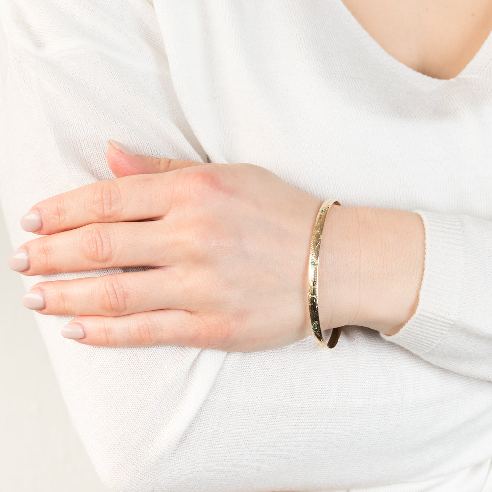 9ct Yellow Gold Hand Engraved Natural Emerald Oval 65mm Bangle