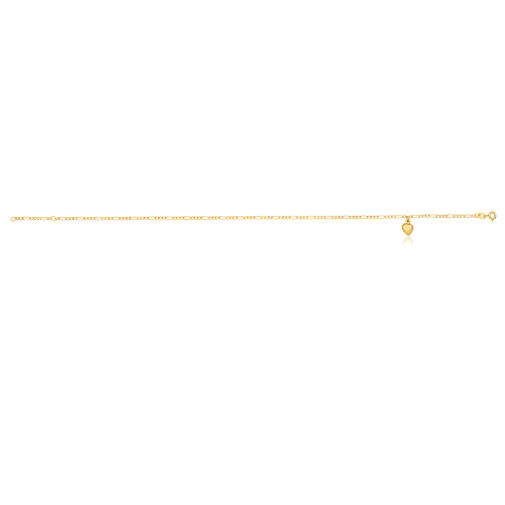 9ct Yellow Gold Heart Charm 3:1 Figaro 29cm Anklet