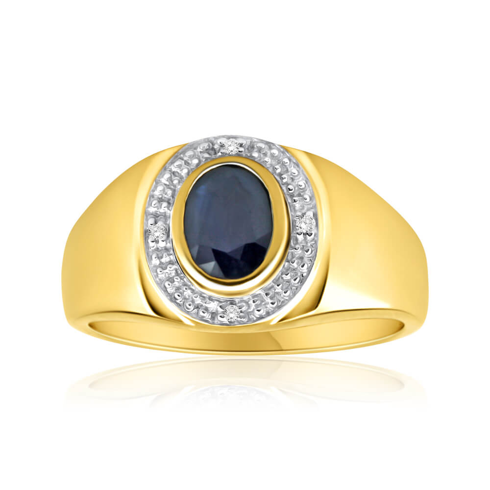 9ct Yellow Gold Natural Black Sapphire + Diamond Gents Ring