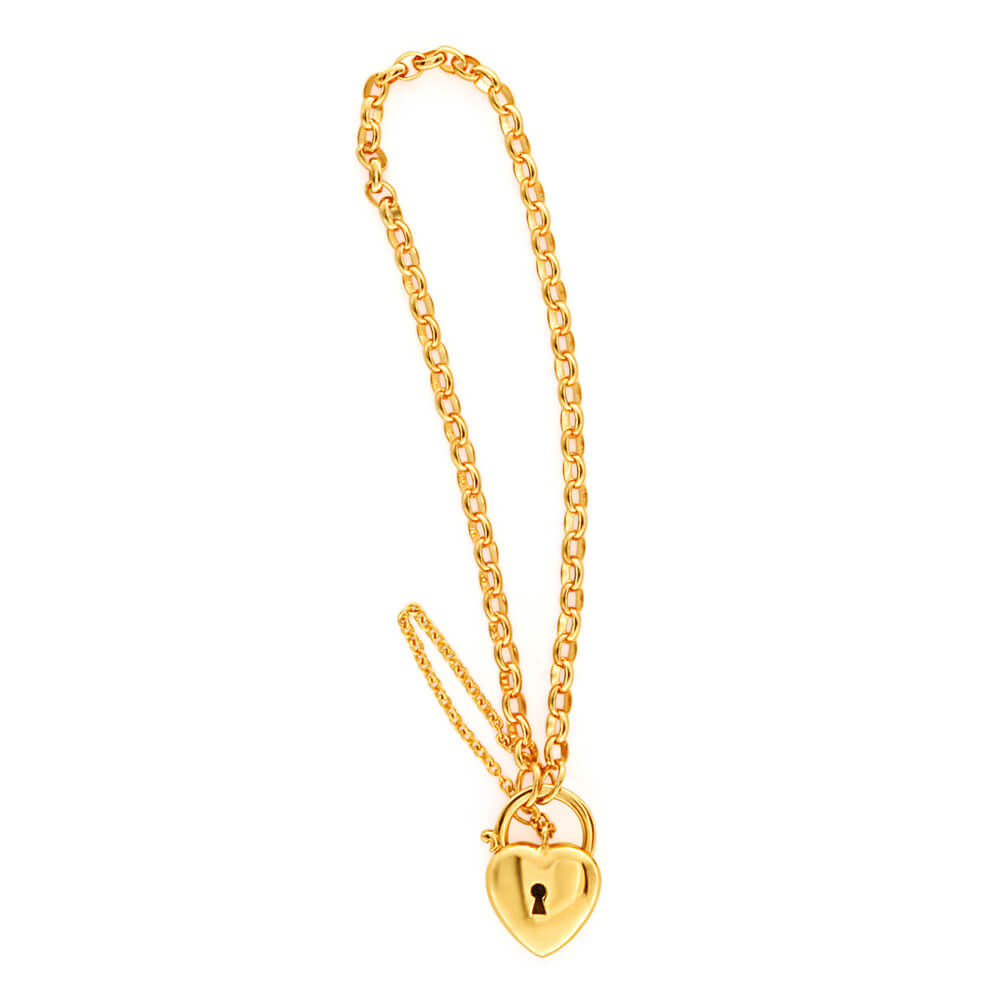 9ct Yellow Gold Oval Belcher Plain Heart Charm Padlock 19cm Bracelet
