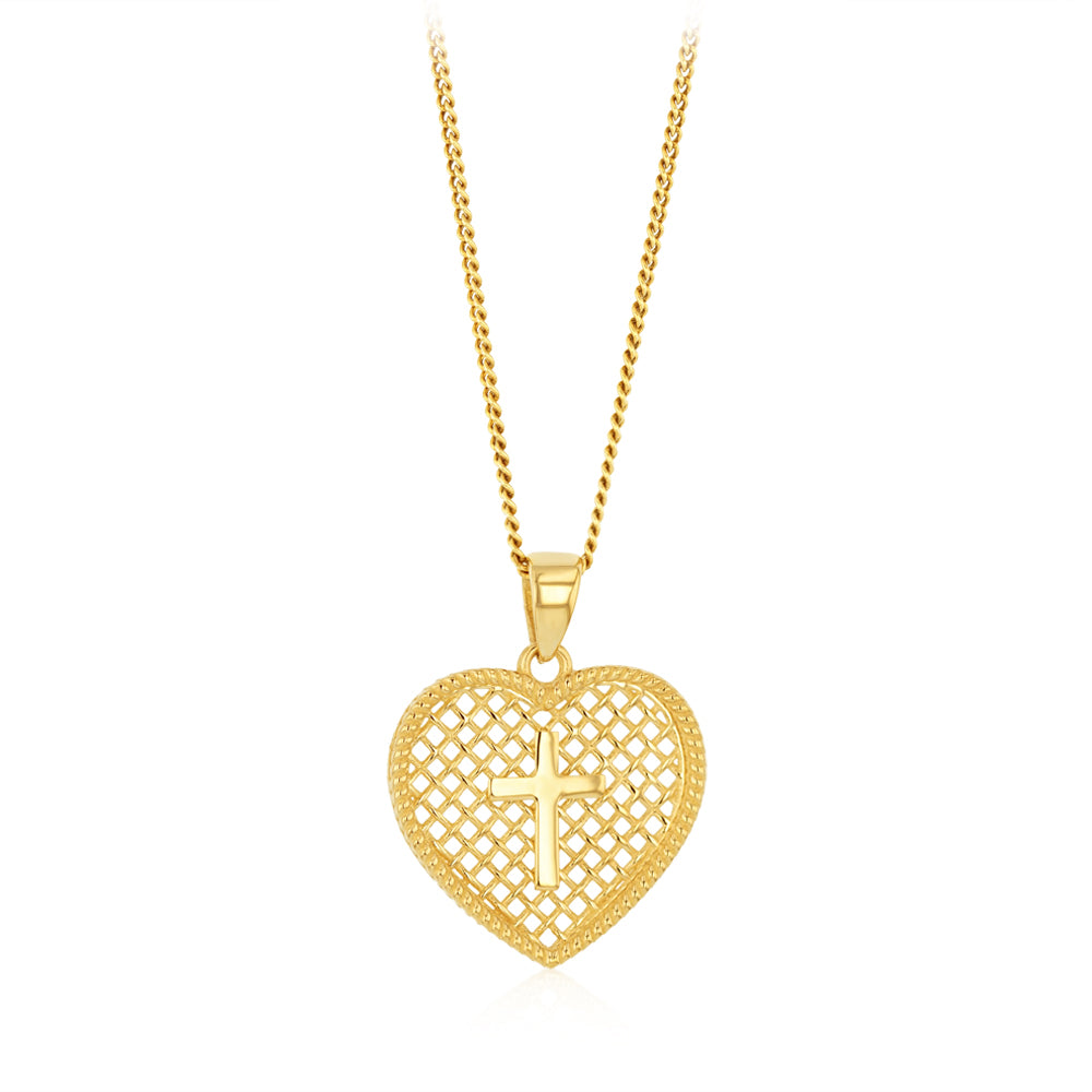 9ct Yellow Gold Patterned Heart Cross Pendant