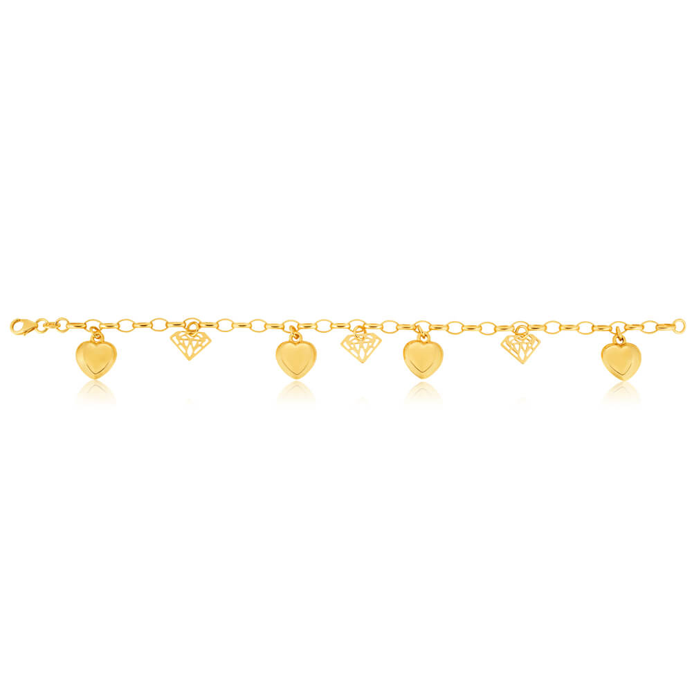 9ct Yellow Gold Silver Filled Heart & Diamond Shape 19cm Bracelet