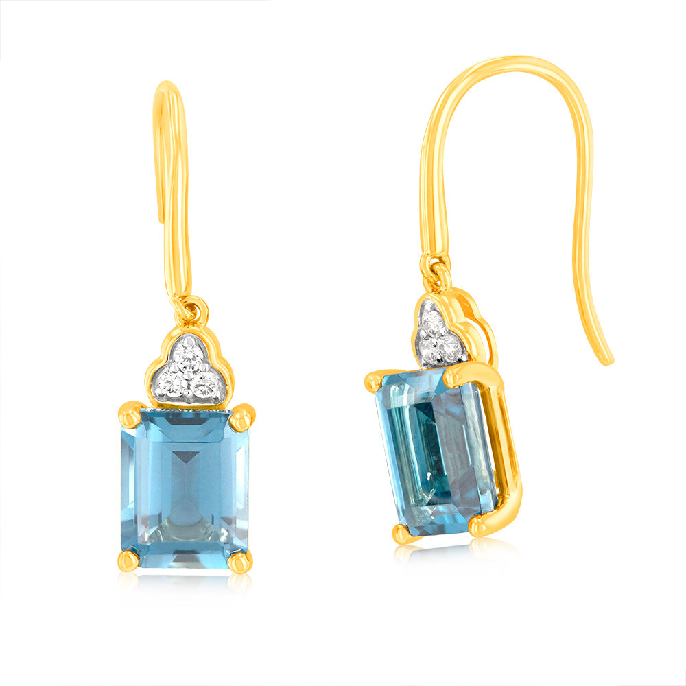 9ct Yellow White Gold 5.6ct London Blue Topaz Emerald Cut with 1/10 Carat Diamond Drop Earrings