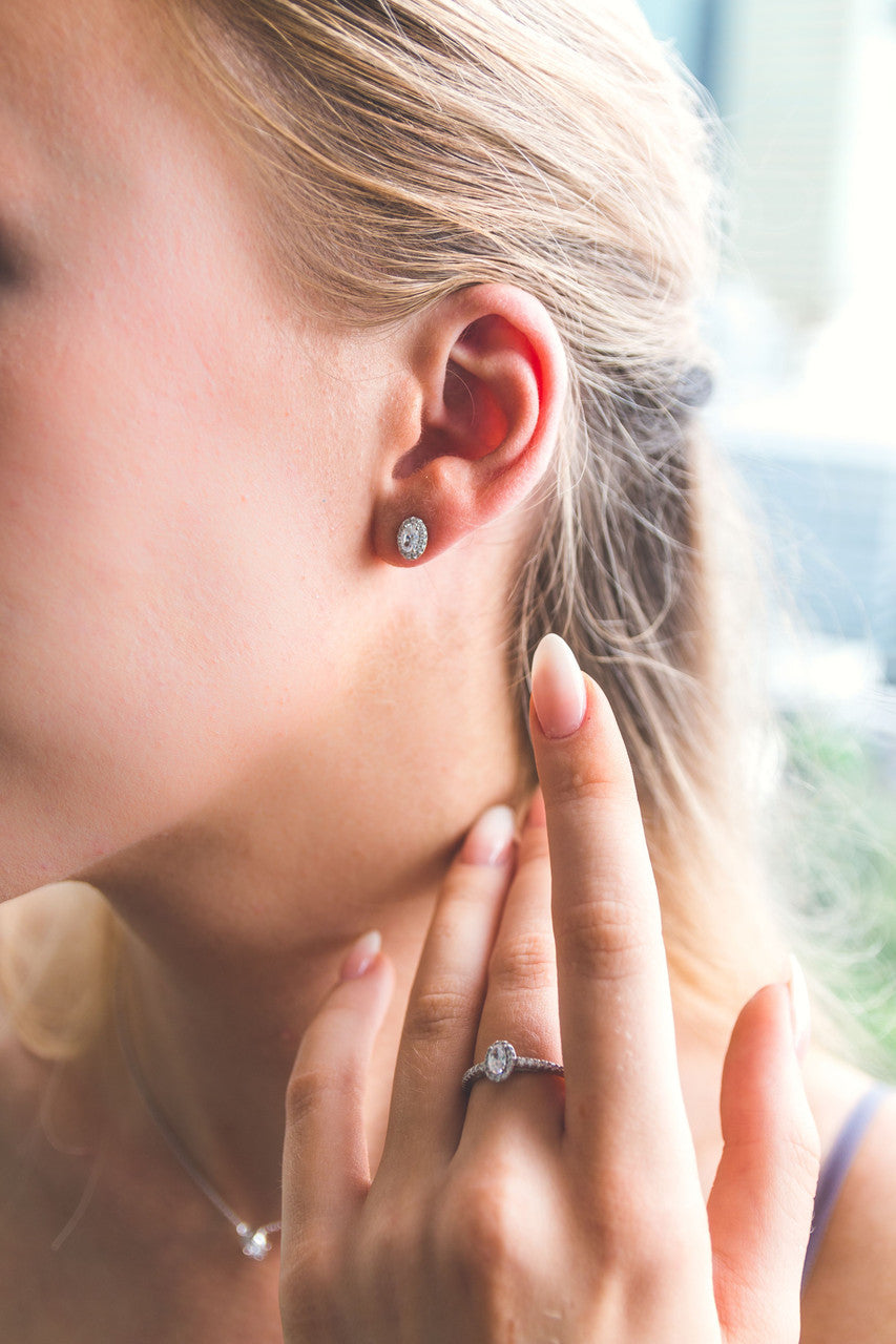 Shine all day and all night in the Glow Earrings from the Aurora collection by Georgini. Featuring perfect petite oval cubic zirconia's surrounded by a shining halo, these earrings are wonderful addition to any collection. Match it with the Glow ring and pendant to create a timeless set. Crafted from luxurious 925 Rhodium plated Sterling Silver measurements approximately 7.92mm x 5.82mm oval halo.