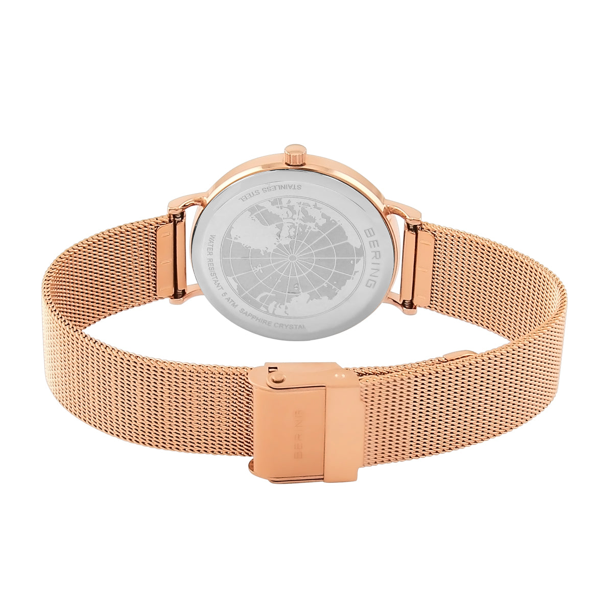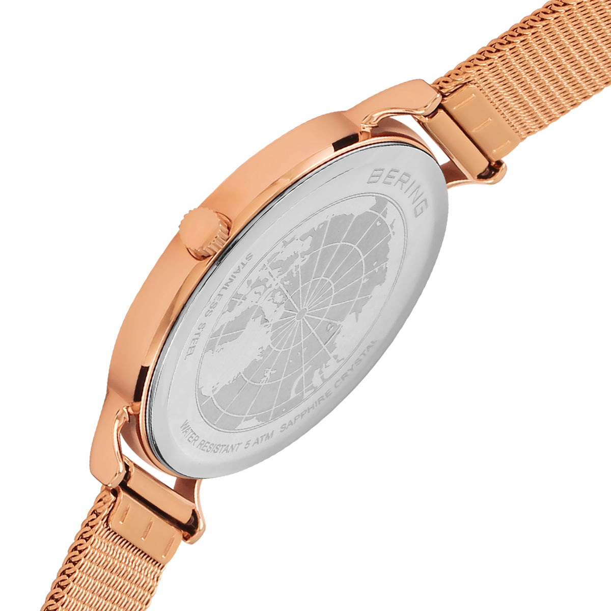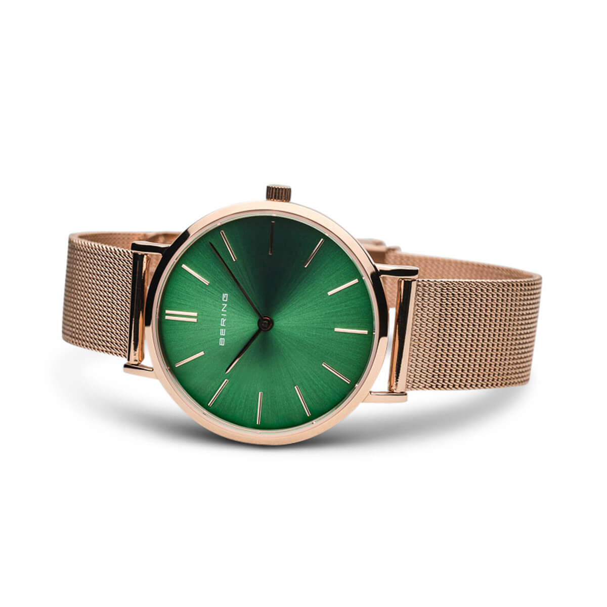 The vivid green dial of the watch is a colour palette that presents us with shades of green under different lights. A striking new addition to the Bering Time’s Classic collection, this watch features a scratch-resistant glass crafted from flat sapphire crystal. A feature enhances the value of this exceptional green dial, placed within a rose-gold polished durable case.