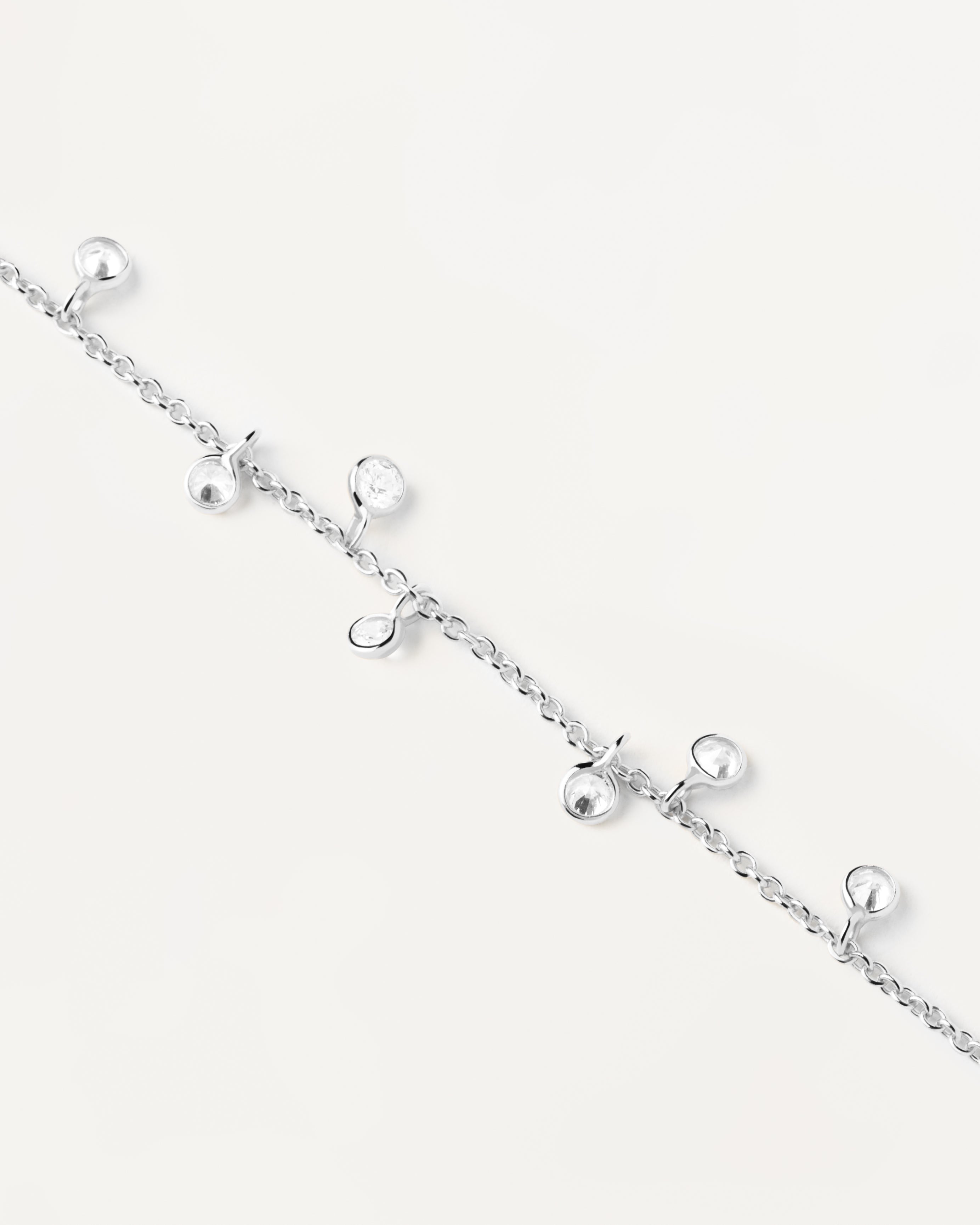 The Essentials embody refined effortlessness. Timeless pieces with smooth lines and the added dazzle of white zirconias. Unpretentious staple pieces that are perfect for everyday wear but can also work on special occasions.The Bliss Silver Bracelet is set with flashy round cut zirconia stone pendants on a 925 sterling silver cable chain and a traditional spring-ring closing mechanism.