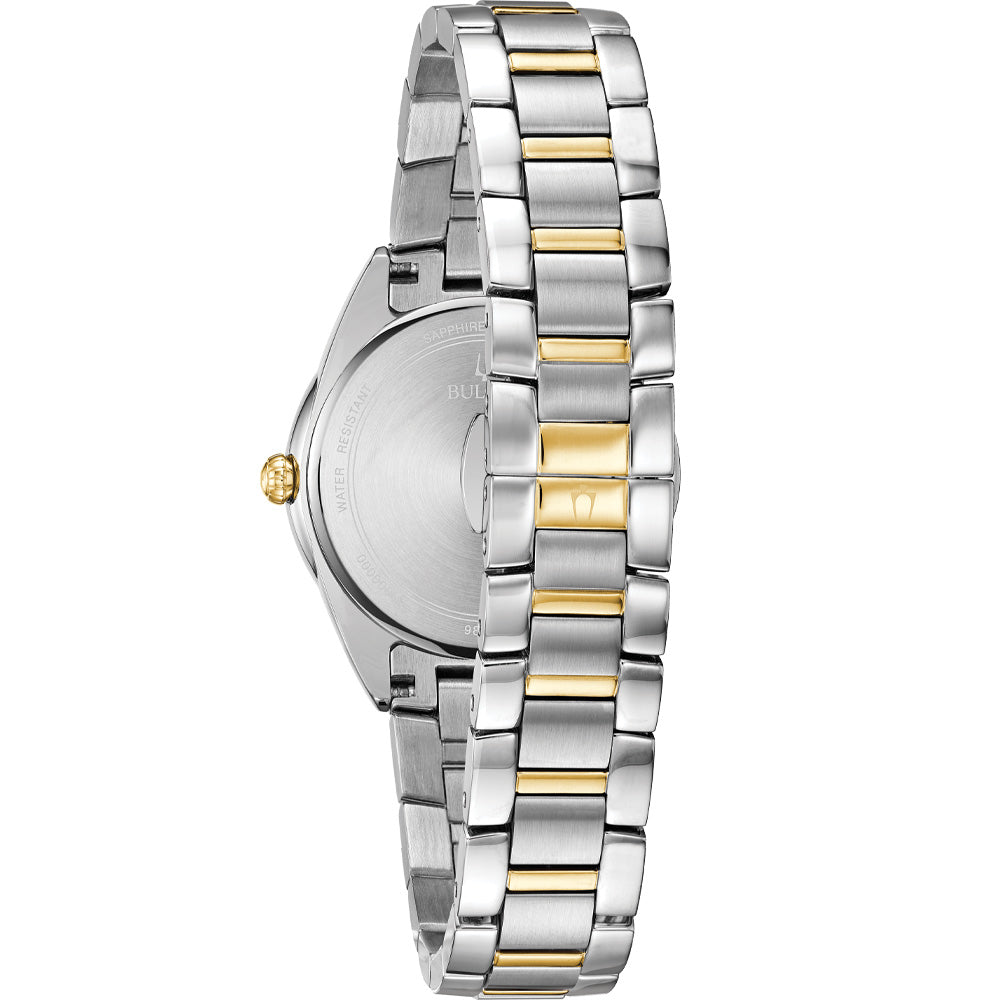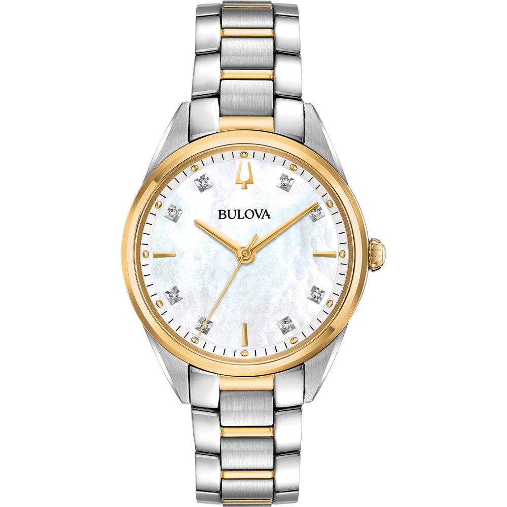 • Slim stainless steel and gold-tone case • White mother-of-pearl three-hand dial with 8 diamonds • Domed sapphire crystal, stainless steel and gold-tone bracelet with push-button clasp • Quartz movement, and water resistance to 30 meters. • Case Material: Stainless Steel • Case Diameter:32.5, Case Thickness:8.4 • Functions:3 Hand • Crystal: Domed Sapphire Crystal • Case Colour: Two-Tone, Dial Colour: White, Strap: Two-Tone
