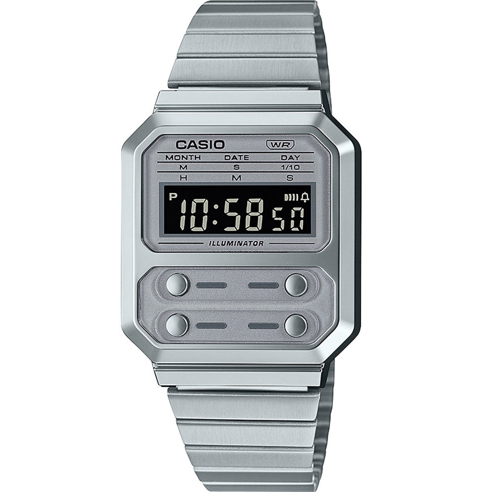 Embracing retro classics, this Casio A100WE-7B Mono Tone Digital Watch is striking. This stylish, non-gendered timepiece comes straight from the Casio vintage collection. The iconic layout features four front buttons with metallic components for an updated take on a vintage classic. Retro in look but full to the brim with functionality, the timepiece boasts a stopwatch, calendar, and water resistance for daily use as well as an LED light for easy reading in dim lighting. This watch is your new everyday favourite.