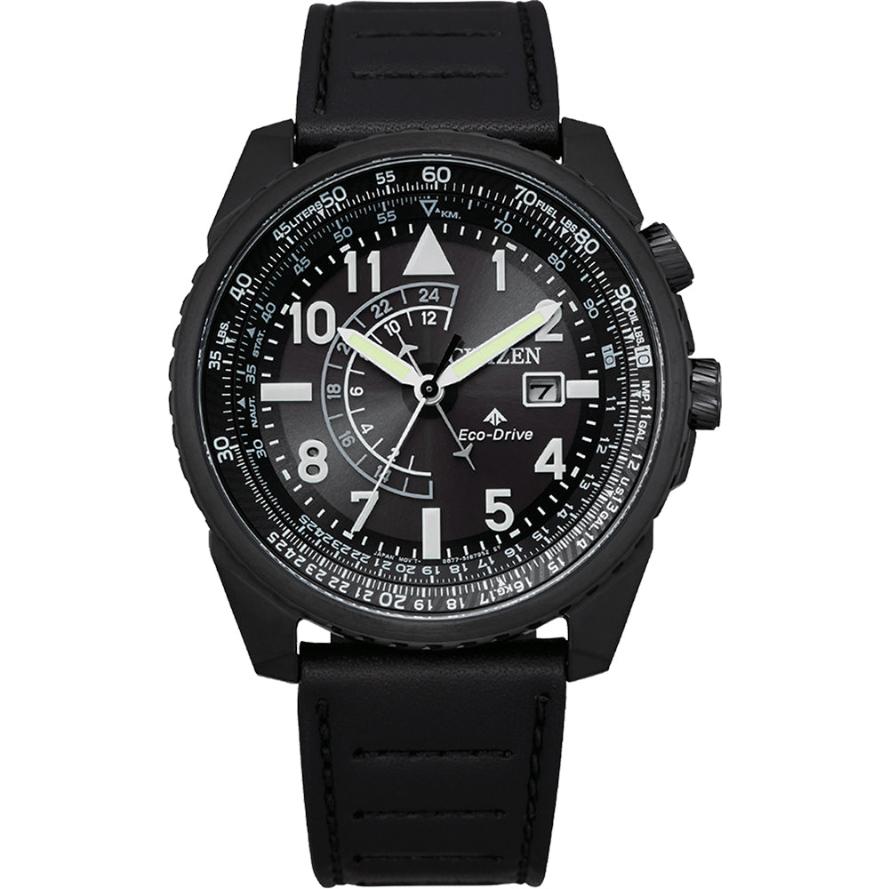 • Promaster Sky Collection • Technology - Eco-Drive • Case Size 42.5mm • Glass - Mineral Crystal • Case Material - Stainless Steel • Band - Leather Strap, Buckle • Water Resistant - 200 Metres • Dual time Display