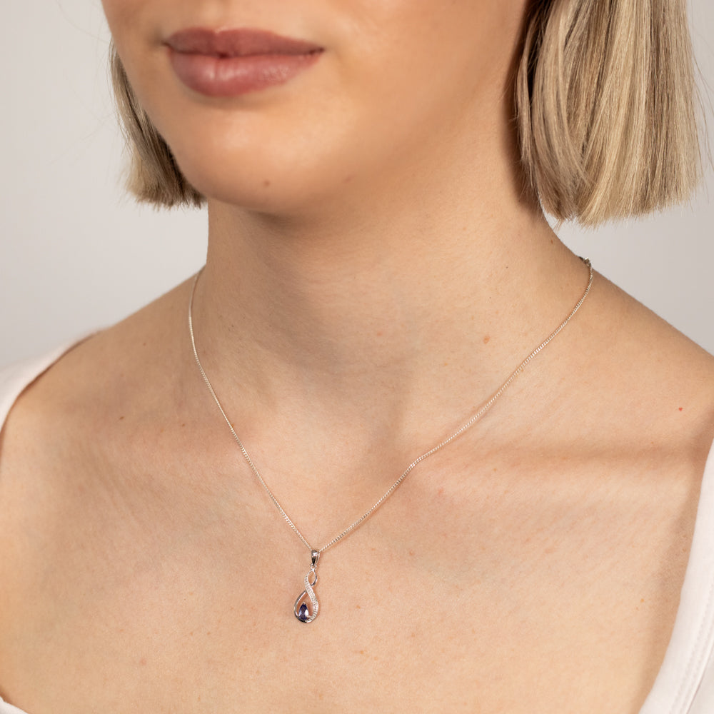 Created Pear Cut Tanzanite & Diamond Infinity Pendant in 9ct White Gold
