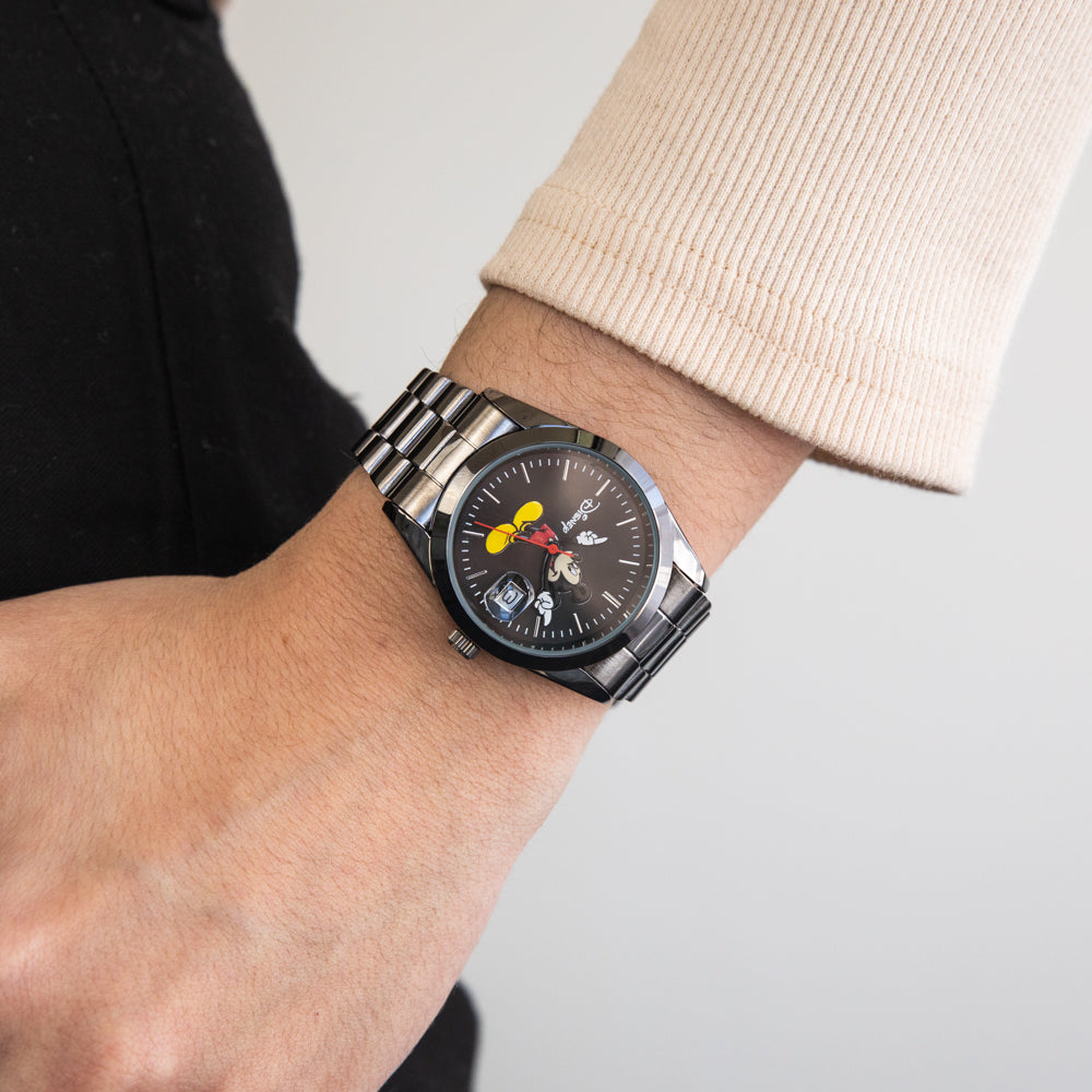 • Accurate quartz timekeeping • Darkened stainless steel • Date window