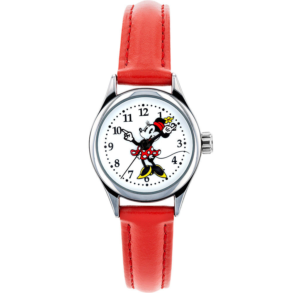 • Quartz timekeeping • Stainless steel case • Red leather strap • Iconic Minnie Mouse design
