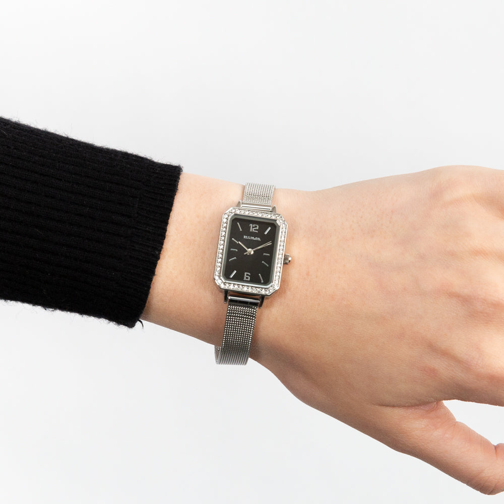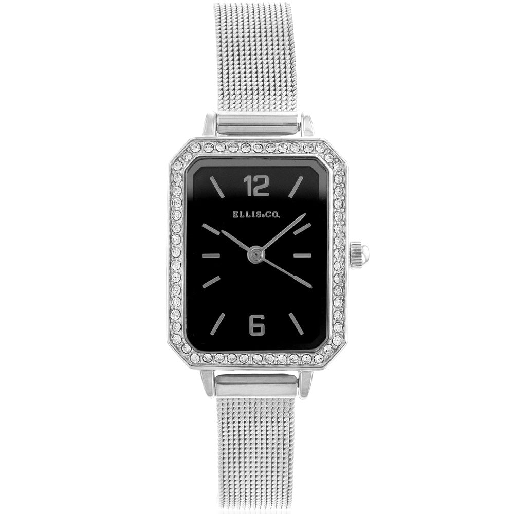 Go classic with this stylish Ellis & Co Lola Stainless Steel Mesh Women's Watch. A rectangle dial is an easy way to give your look a chic edge, letting you step out in confidence everyday. The bezel is embellished with sparkling crystals that add glamour to the piece, while the black backdrop keeps the timepiece understated. A thin, silver mesh band is both comfortable to wear and perfect for those with petite wrists. Wear the watch on its own or pair it with silver jewellery for a complete and curated look.