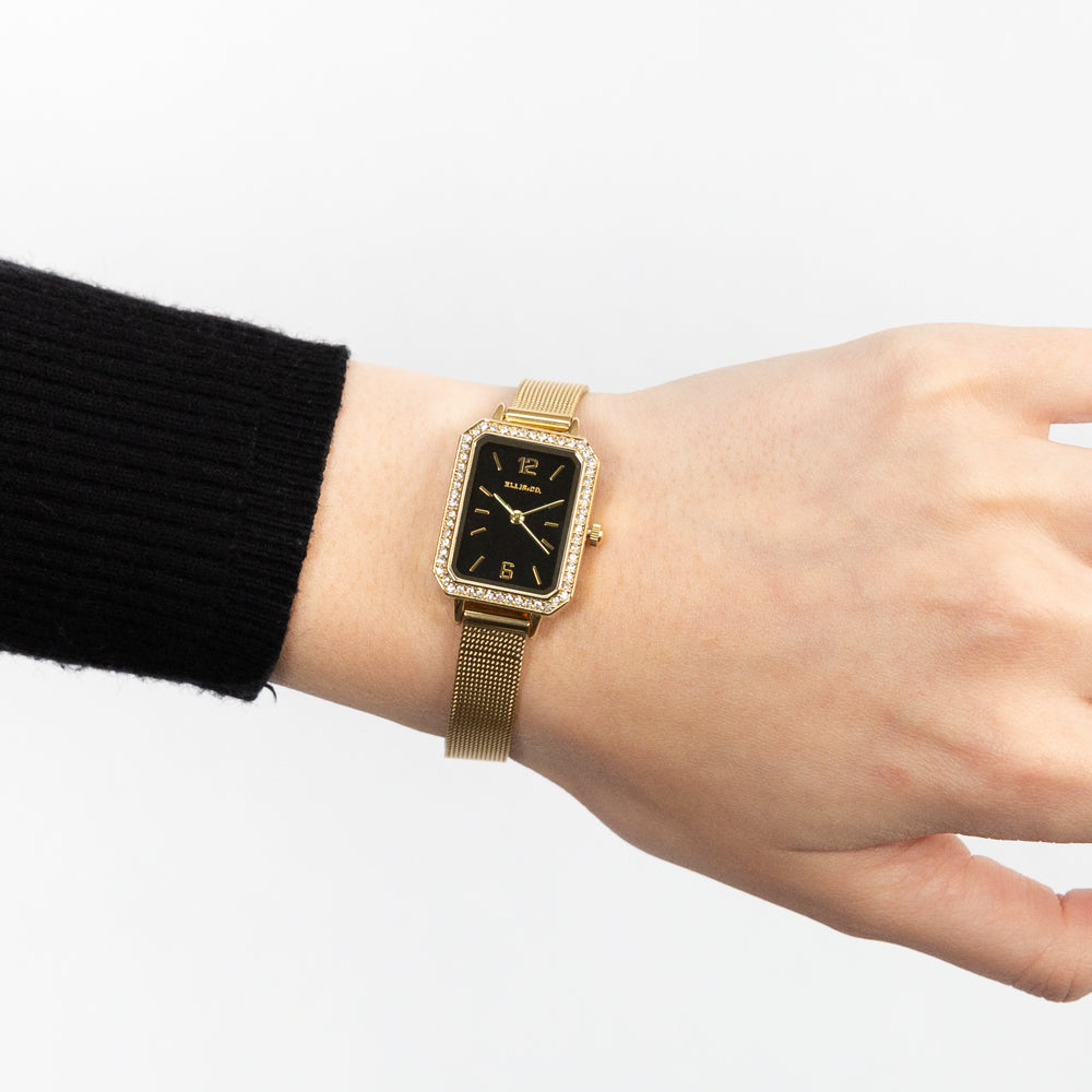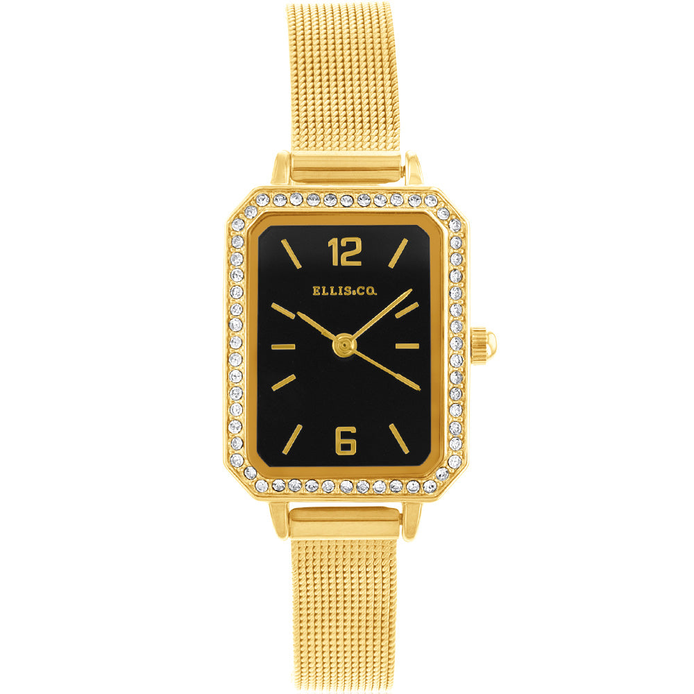 A classic timepiece, this Ellis & Co Lola Stainless Steel Mesh Women's Watch is stunning. Crafted in the warm tones of yellow gold with a shiny lustre and smooth finish, a gold watch is a must-have in any watch collection. The rectangle dial featured a black watch face that effortlessly contrasts the warm gold tone. Not only this, but the bezel is embellished with glittering stones that add a touch of glamour to your look. Wear this watch to a formal event or professionally, the opportunities are endless.
