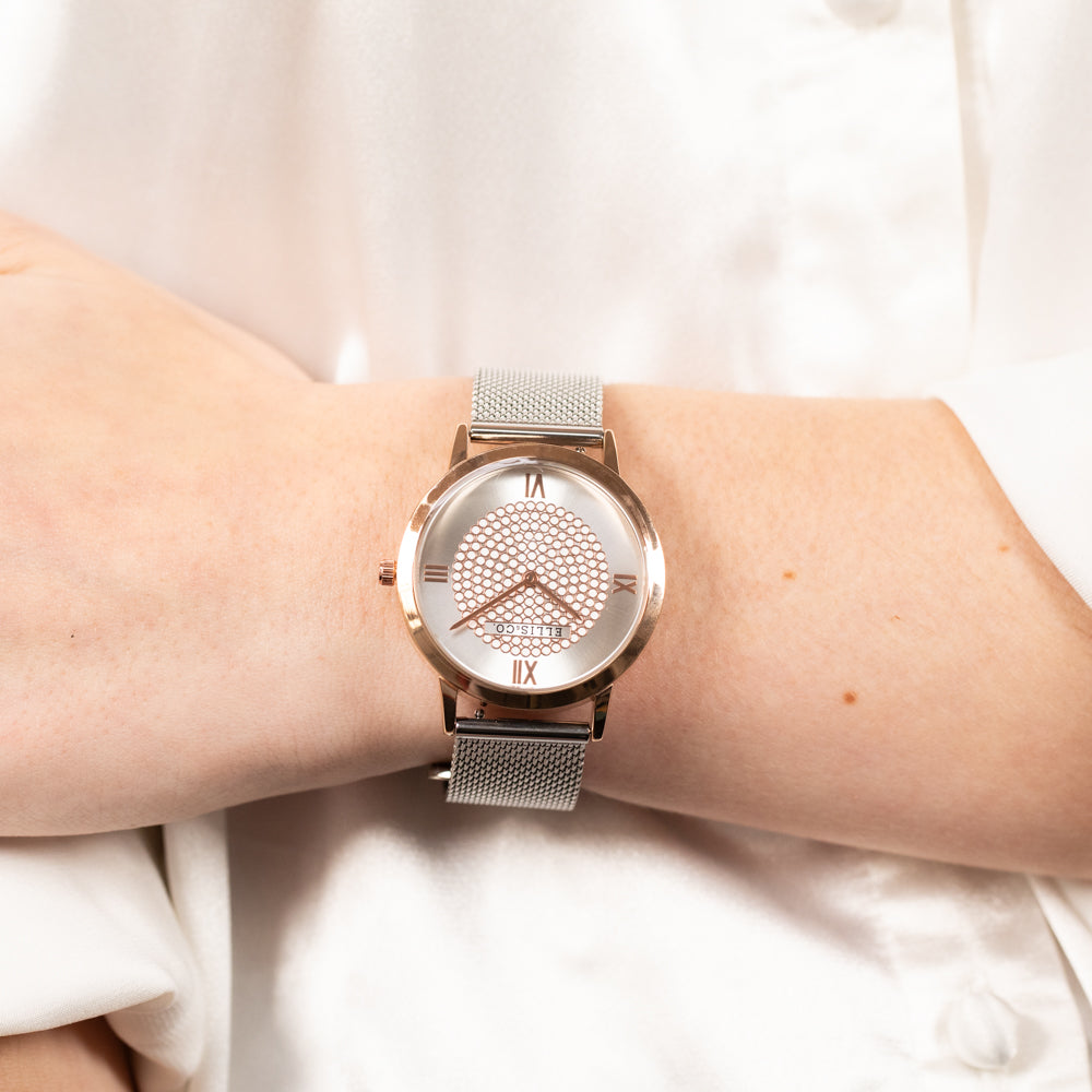 - Movement: Japan 2035 Movt - 36mm Case Size - Thickness: 7.5 mm - 30 Meters Water Resistant - Mineral Glass - Silver Stainless Steel Mesh Strap