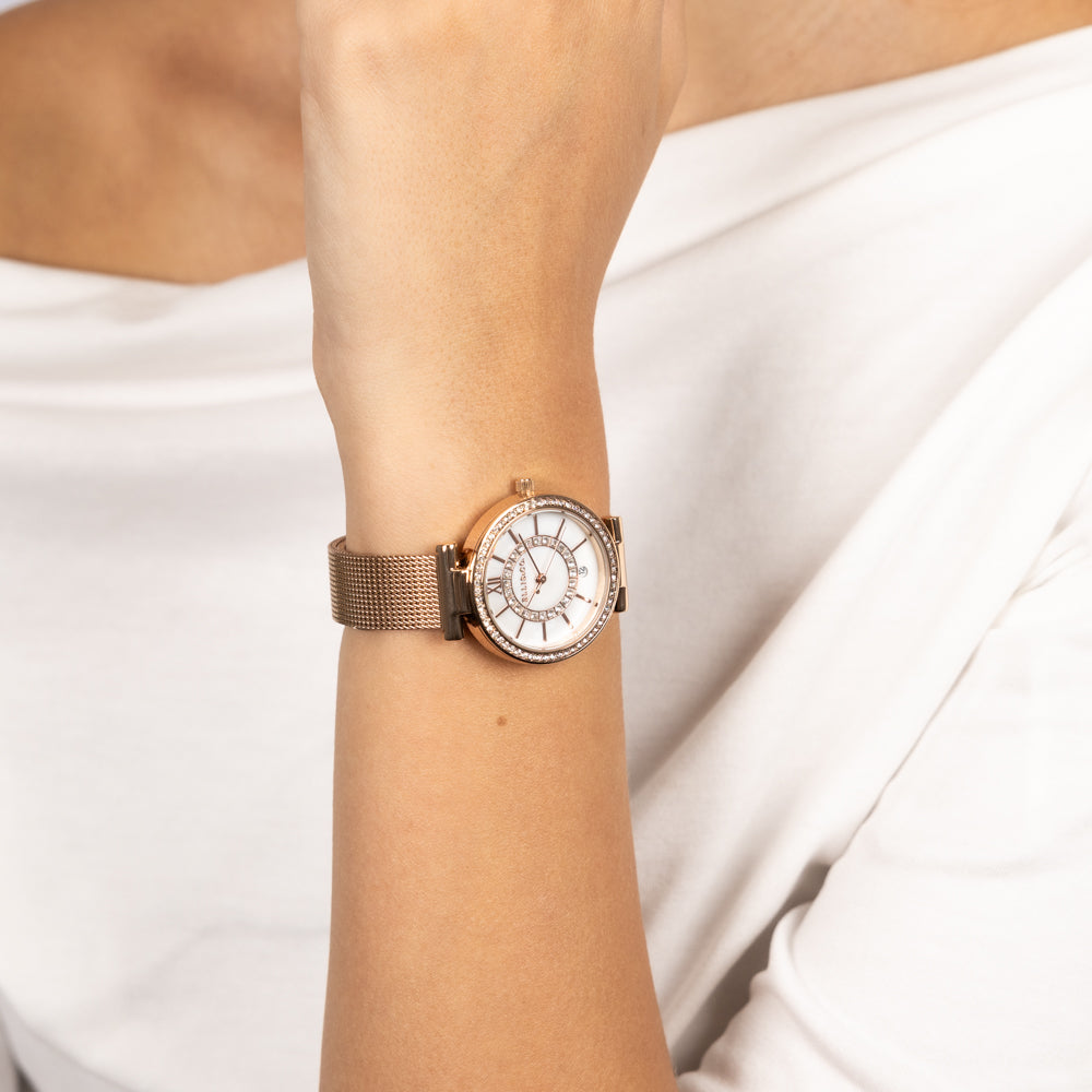 - 32mm Case Size - Mother of Pearl Dial - Miyota Date Movement - Stainless Steel Mesh Strap - 30 Meters Water Resistant