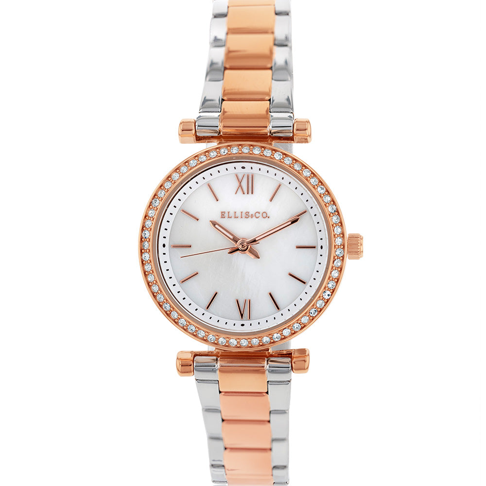 Timekeeping has never been more stylish than with this Ellis & Co Serena Stainless Steel Bracelet. With a soft rose gold and silver design, this watch is perfect for everyday wear. Featuring trendy roman numerals and subtle gemstones, this watch turns the fashion game upside down. Blending productivity with style, this Ellis & Co watch will have you looking and feeling divine.