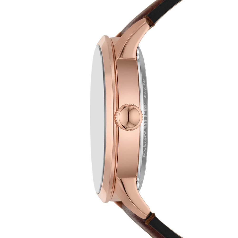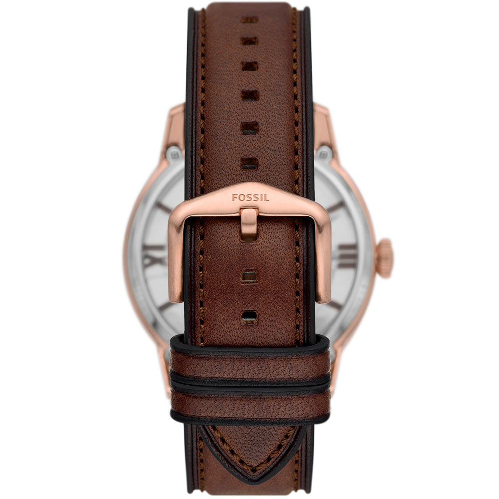 The Fossil Townsman ME3259 Automatic blends timeless elegance with modern craftsmanship. Its rose gold stainless steel case is paired with a sophisticated brown cut-out dial, offering a glimpse of the intricate automatic movement within. The brown leather strap enhances the classic appeal, providing a refined finish.