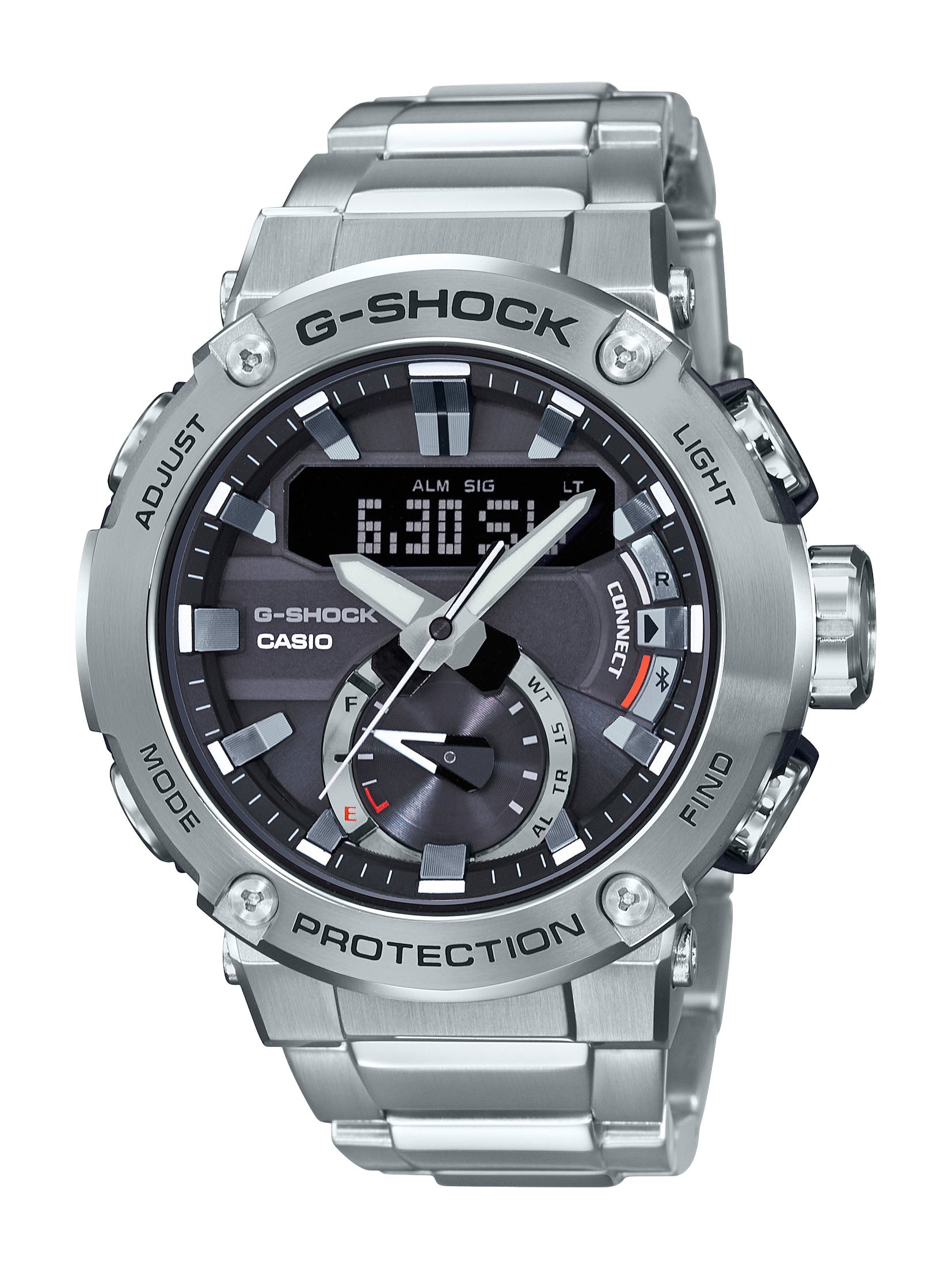 • Shock-resistant • Smartphone link functions: automatic time adjustment, easy watch setting (world time for over 300 cities, home time/world time switching, alarm setting), phone finder • Solar-powered • World Time • 1/1000-second stopwatch • Daily alarm • Full-auto double LED lights (Super Illuminator) • 20-bar water resistance