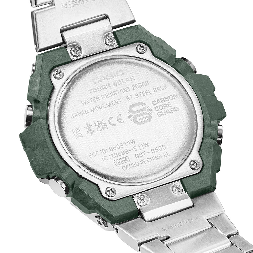 • Hybrid analogue/digital display • Stainless steel • Carbon Core Guard • Water resistance to 200m • Tough Solar • Bluetooth connectivity • Daily alarms • Stopwatch, timer, calendar • World time