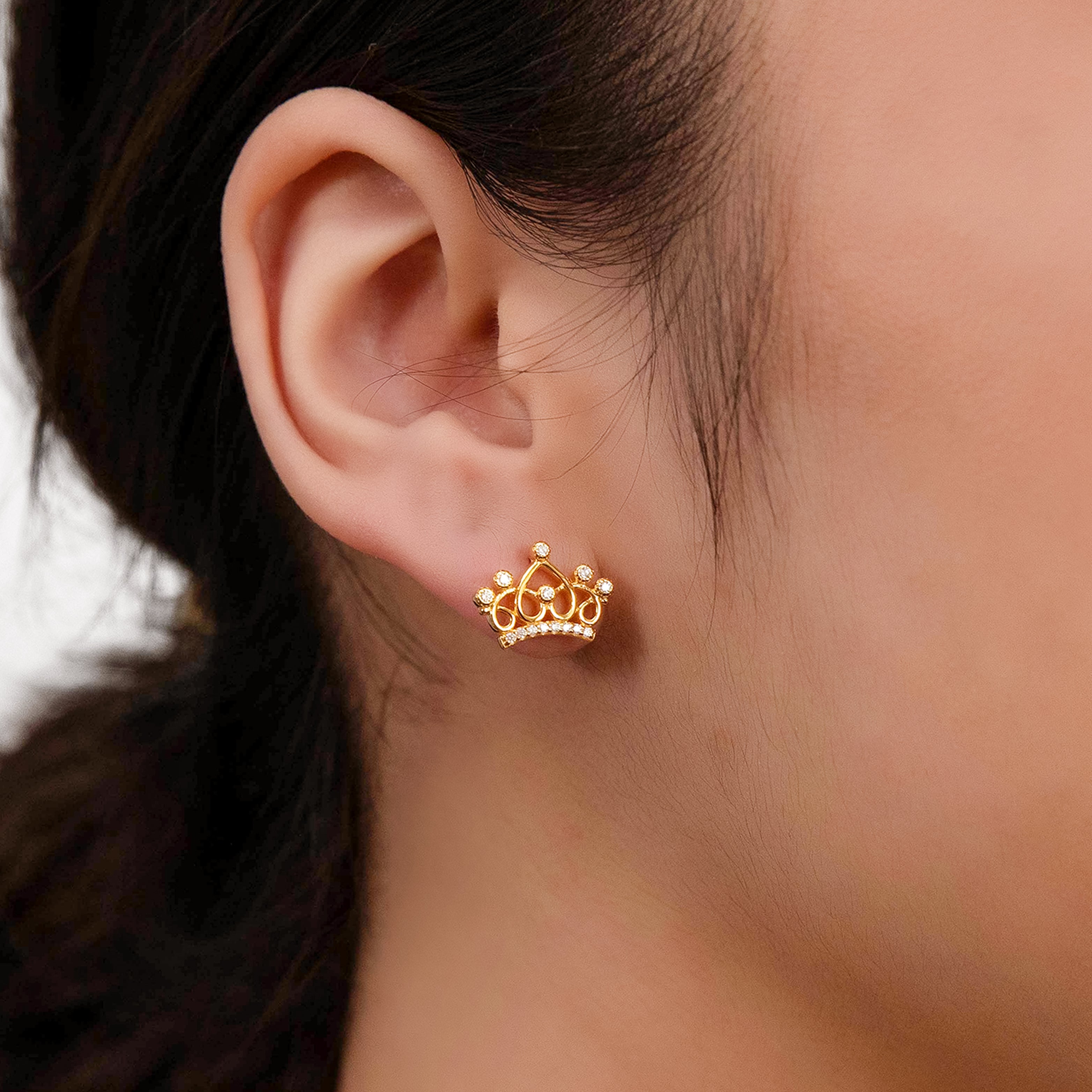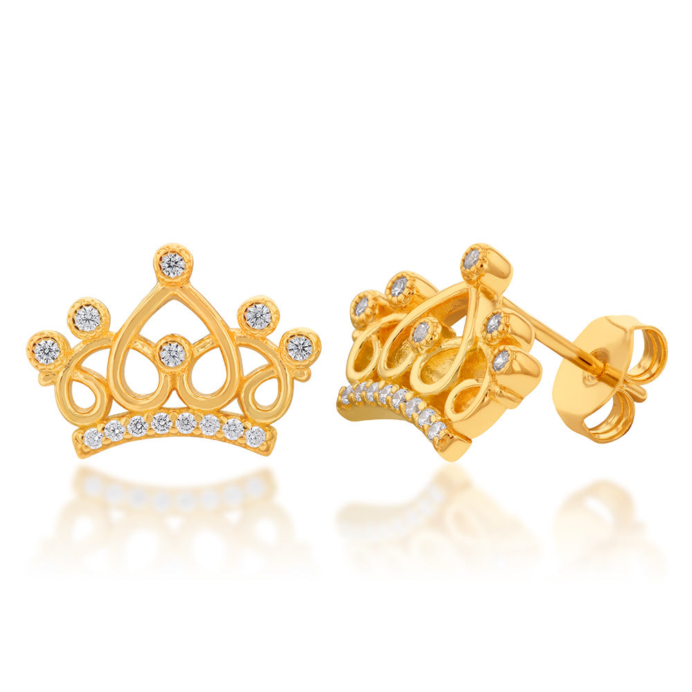 Gold Plated Sterling Silver Fancy Crown With Cubic Zirconia Stud Earrings