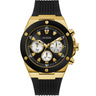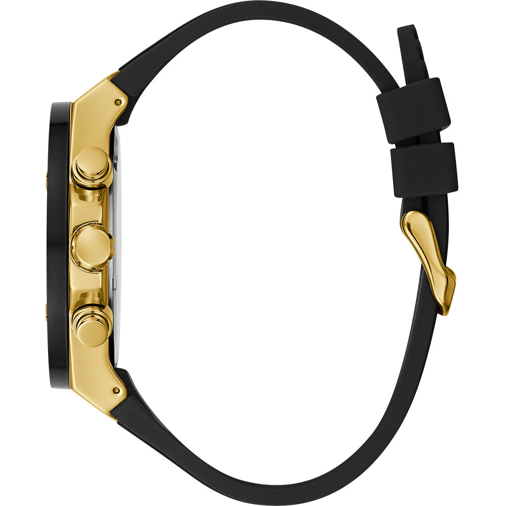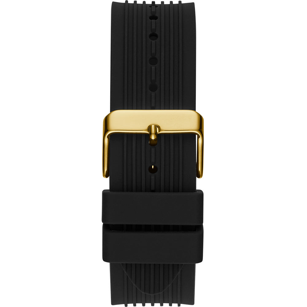 This Guess Mens Poseidon timepiece is manufactured in a chronographic style, this versatile watch dial provides a multifunctional purpose with day, date, and 24-hour international time. This stylish watch is made with a gold-tone stainless steel case bordering a black dial and bezel, with a silicone adjustable strap. This timepiece is a bold statement piece that can elevate anyone’s style.