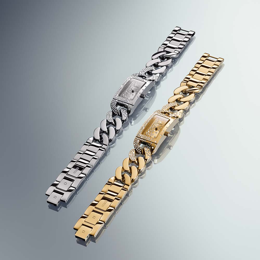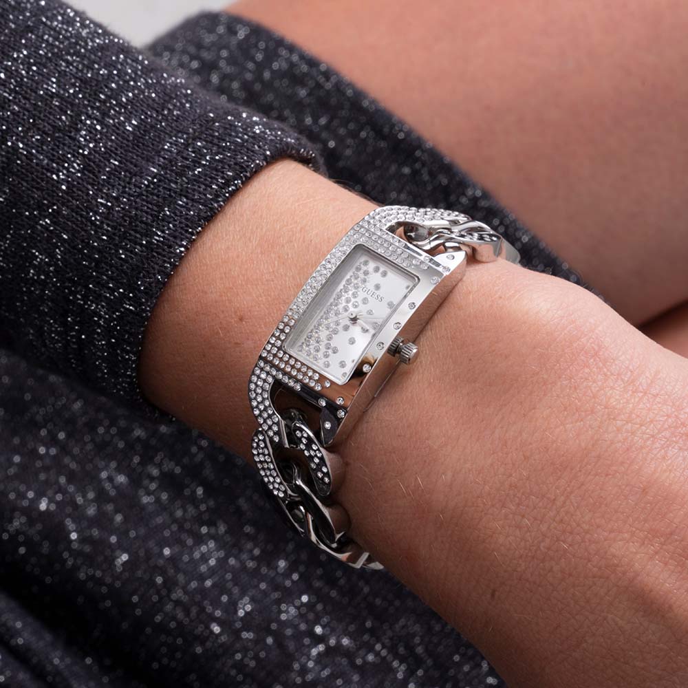 Introducing the Guess GW0298L1 Starlit Multi-Chain Watch, where elegance meets glamour in a captivating design. Featuring a polished rectangular case in tonal silver, this timepiece exudes a timeless sensibility. The dial and bracelet are adorned with brilliant, scattered stones, creating a mesmerizing Starlit effect that captures attention with every glance. With precise quartz movement and a petite 19mm case size, it offers both sophistication and functionality. Crafted from stainless steel, the bracelet complements the overall luxurious appeal. Designed for durability, it includes water resistance up to 30 meters, making it suitable for everyday wear. The Guess Starlit Multi-Chain watch is a striking accessory that makes a glamorous statement for leading ladies everywhere.