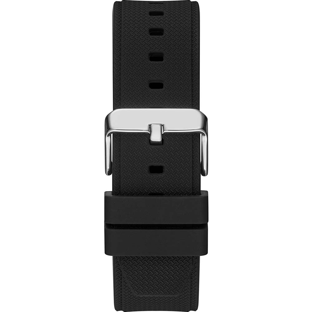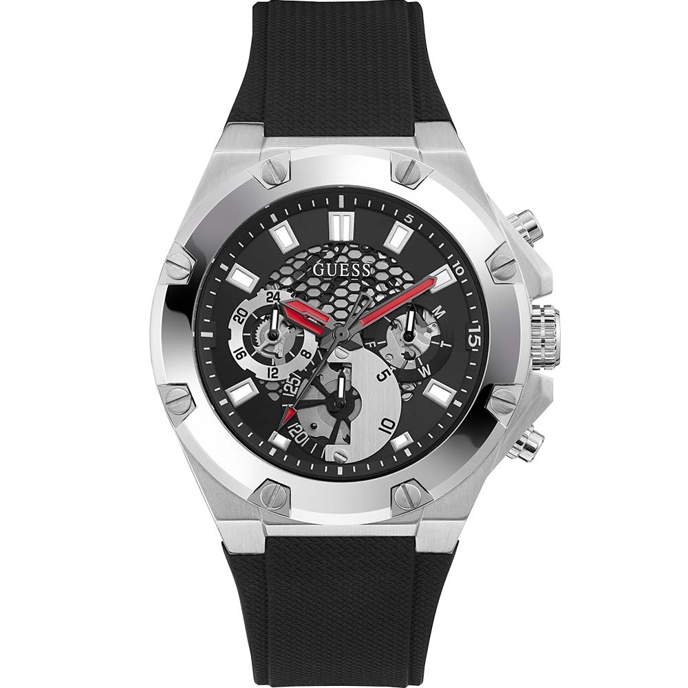 Style meets functionality in this unique Guess GW0334G1 Third Gear Unisex Watch. A black, silicone band is comfortable for everyday wearing and conforms to the wrist nicely while providing the versatility of day to night wear. The dial meets skeletal sophistication with an intricate chronograph that features a window into the mechanisms of the watch. Complete with a pop of red that improves readability, this Guess watch is a real showstopper.