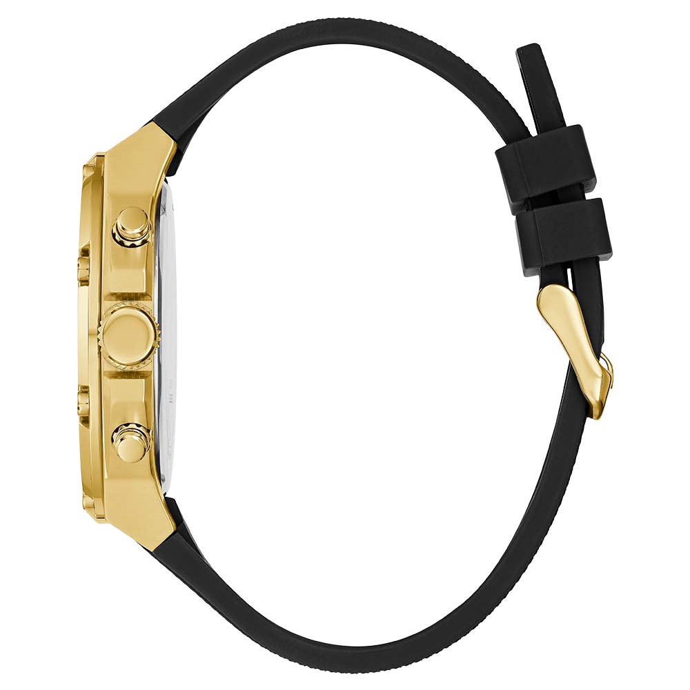 Step out in style everyday with this unique and classy Guess GW0334G2 Third Gear Unisex Watch. The black and gold design is especially chic, with its silicone watch strap that is comfortable to wear. The dial is unlike any other, with the smooth finish of stunning yellow gold and the intricate details of chronograph. Guess watches are a staple in any wardrobe, they can be dressed up or down with ease and are a piece that is sure to turn heads. Fine details in the design really make this piece stand out with an almost mechanical feel.